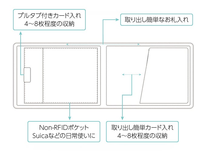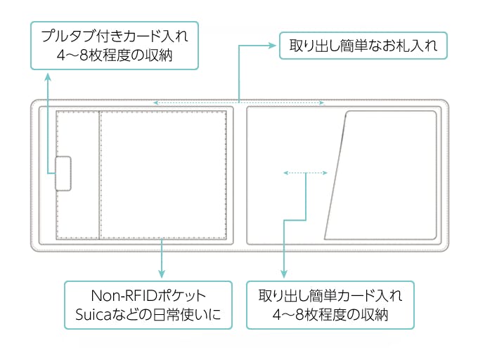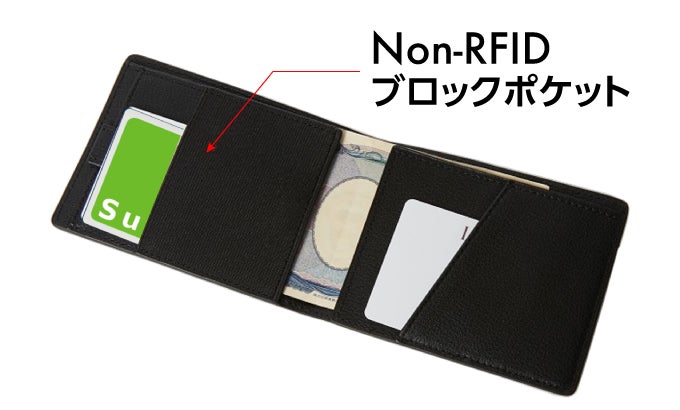 また財布を開いて即タッチできるように、Non-RFIDブロックポケットも搭載。SuicaなどのICカードを使用する際に取り出す必要はありません。