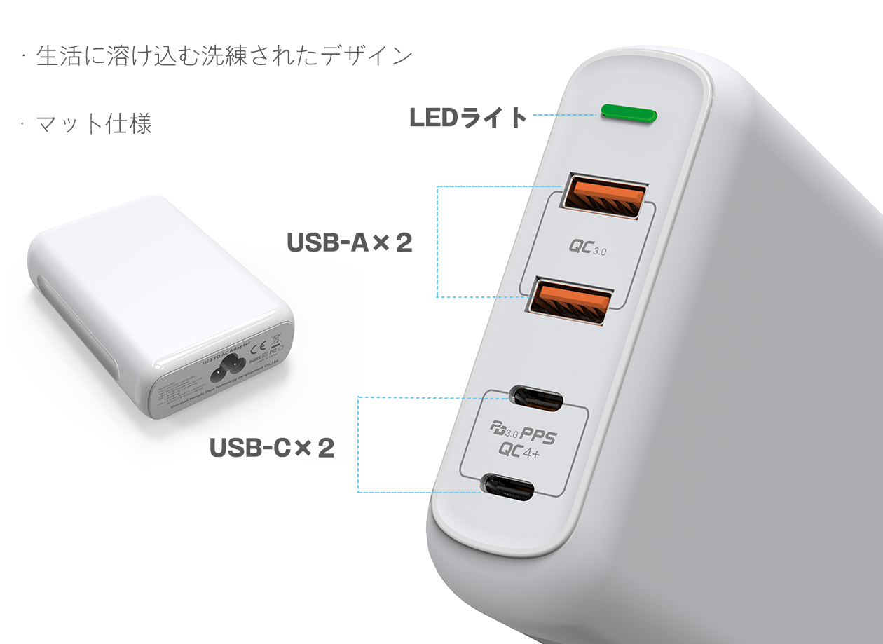 ・複数同時に充電できる4ポート搭載(Type-A×2、Type-C×2)