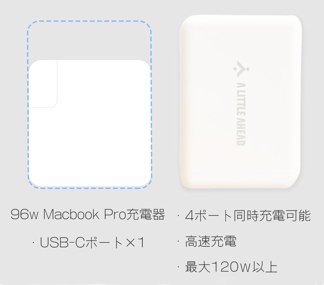 100Wを超える大出力が可能なため、純正アダプタよりは少し大きくなってしまいますが、そのサイズと引き換えに4ポートとより大きな出力が手に入ります。