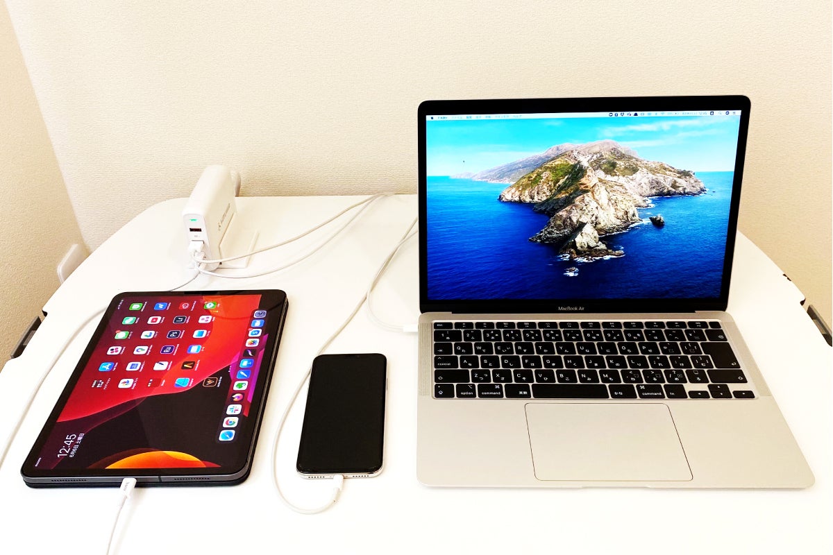 例えばiPhone11なら30分かからずに50%以上の充電ができ、MacBook Proなどの必要電力が高い機器も高速に充電ができます。