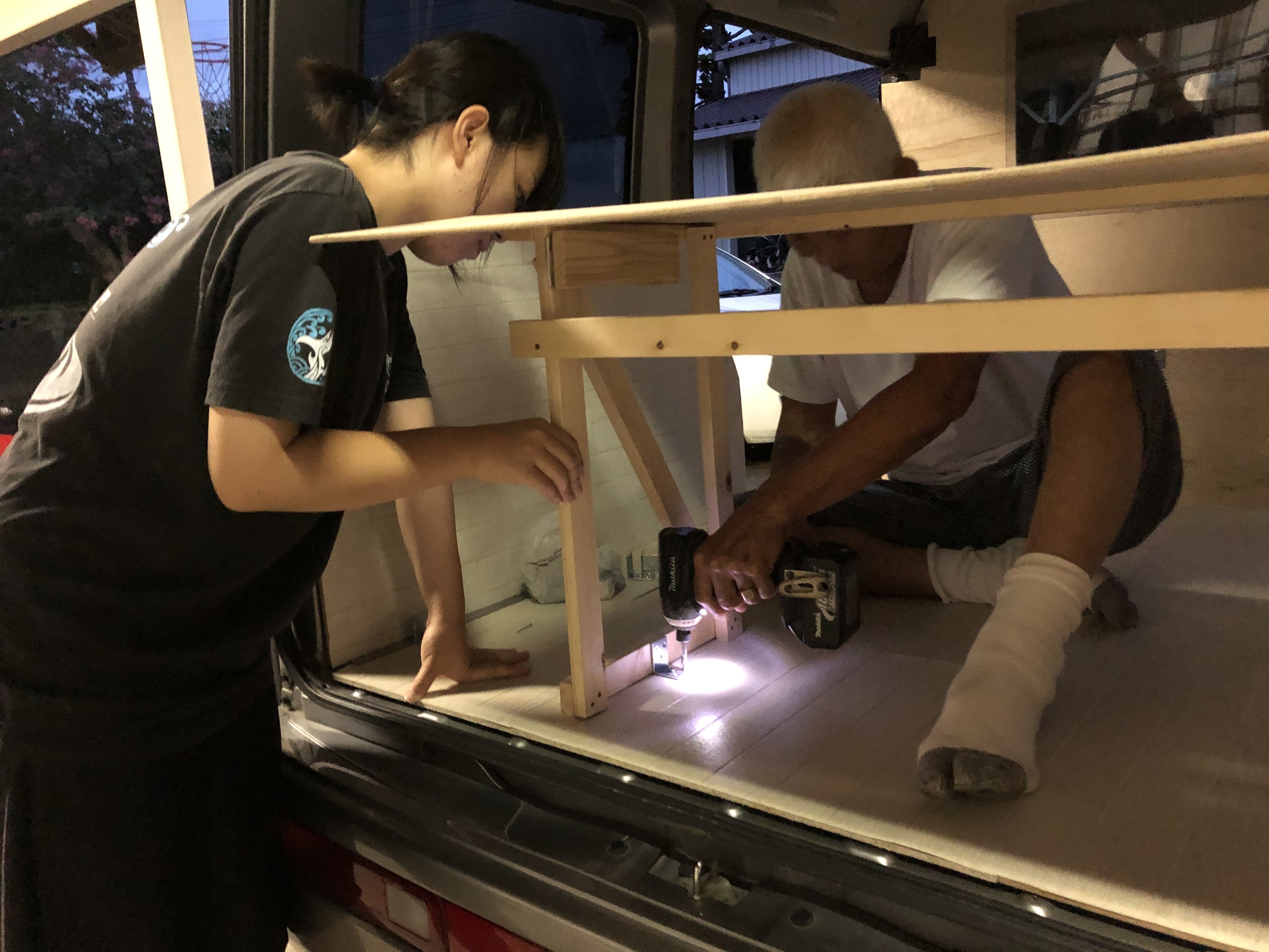 キッチンカーDIYも順調?に進んでいます!思っていたより難しくて、想像以上に時間はかかっていますが、着実に形になってきているので、その様子を少しお届けしたいと思います!*Day1*まずは、換気口となる窓に虫除けとなる網戸の設置を行いました。網戸ってどうやって設置するんだろう?調べてもよく分からず、何度も試行錯誤を繰り返しました。初日から苦戦しまくりでしたが、楽しくて23時ごろまで夢中で作業していました!*Day2*二日目は、仕切り板、床、壁など基盤となる部材の切り出しを行いました。この日は、大学の友達で車に詳しかったり、模型作業が丁寧な強力な助っ人が2人も来てくれたので、難関作業がスムーズに進みました。私たちにはなかったアイディアを色々出してくれたおかげで、車の変形的な形通りに木材を切り出すことができました!コロナの影響で全然会えてなかった友人に会えたのも嬉しかったし、みんなでワイワイ進める作業はとても楽しかったです。原口家の番犬リュウくんもたくさん可愛がってもらってました。*Day3*三日目は、前日に切り出した部材たちを取り付けて、シンク台の作成を行いました。この日はじいちゃんが全面協力してくれました。機械屋さんだったじいちゃんは、切るのも留めるのも全て私たちの倍速でした。だいぶ慣れてきていますが、釘をまっすぐ打つのが何気に1番難しいと思います。*Day4*四日目は、シンク台、販売台、戸棚の作成を行いました。連日一日中製作を続けていたおかげで、やっとキッチンカーらしい装備が揃いはじめました。*Day5*五日目は、内装の仕上げ作業を行いました。白を基調とした壁と床に、テーブルクロスでベージュを取り入れました。内装を仕上げると、一気に田んぼでよく映えるようになりました。あと少し!!完成までまだ少し時間はかかると思いますが、着実にキッチンカーらしくなってきています。建築学科だし、DIYすぐ出来るだろう!と考えていましたが、模型とは違う規模感や、車の変形的な曲面に悪戦苦闘しています。残りの作業も頑張ります!