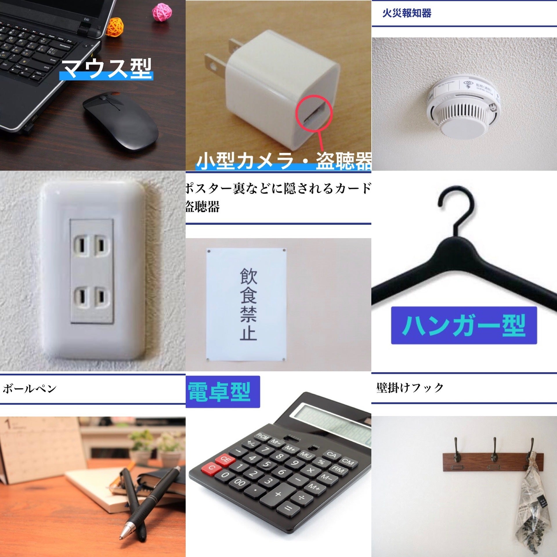 1日1,000個(年間40万個)も販売されている盗聴器・盗撮機は、どこに隠されているのでしょうか?この画像では、今までに取り付けられていた場所、物を載せてみました。