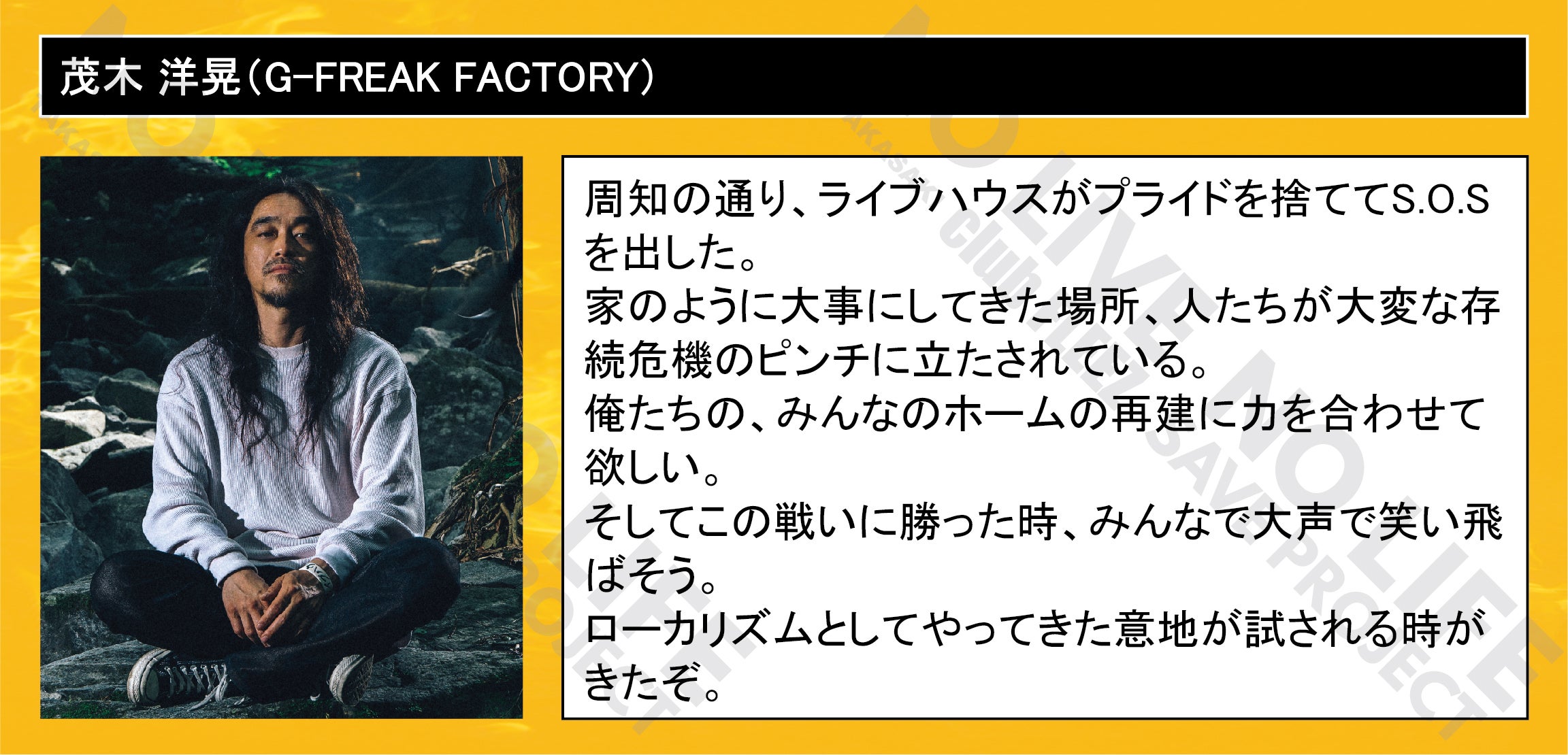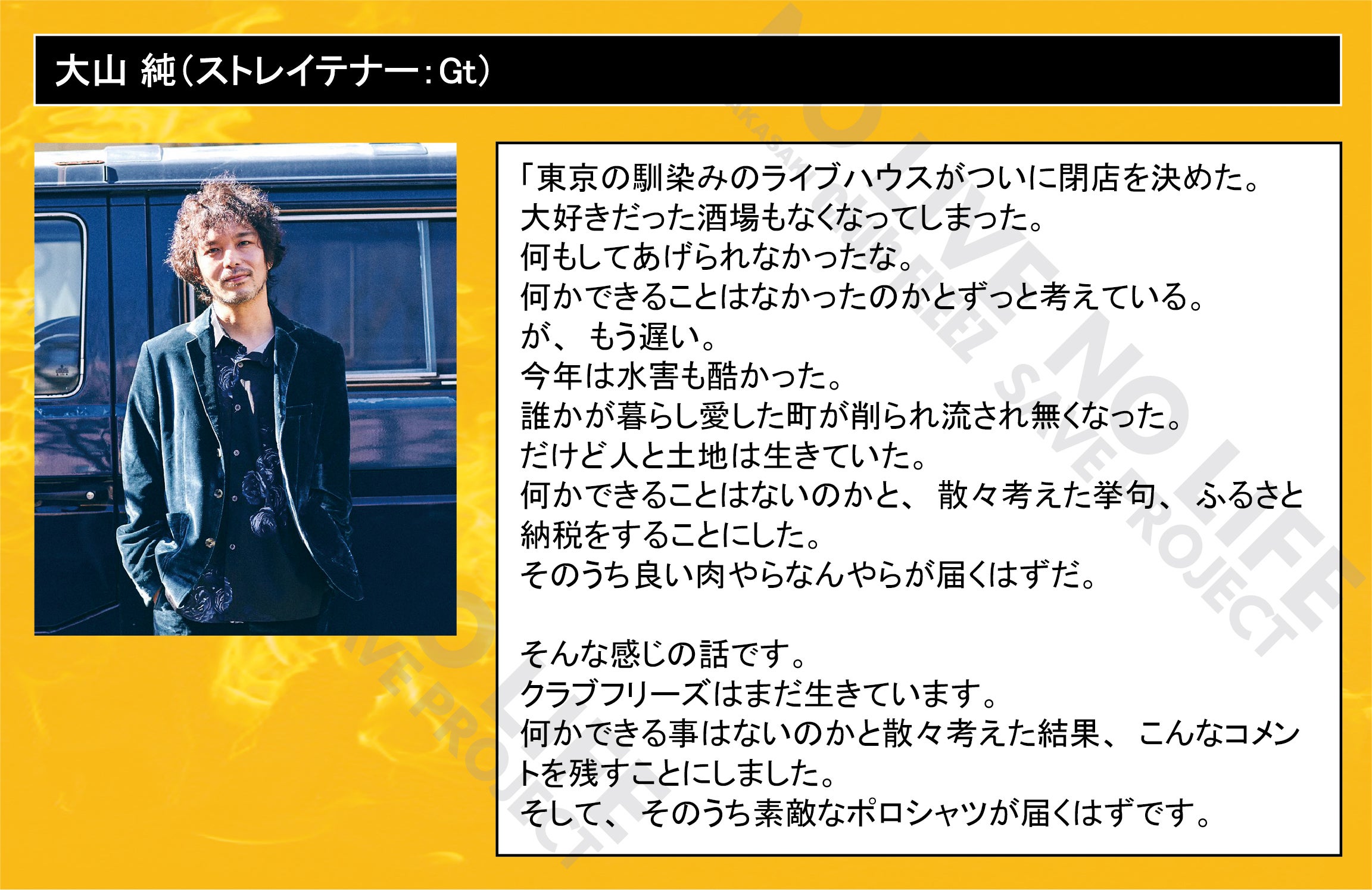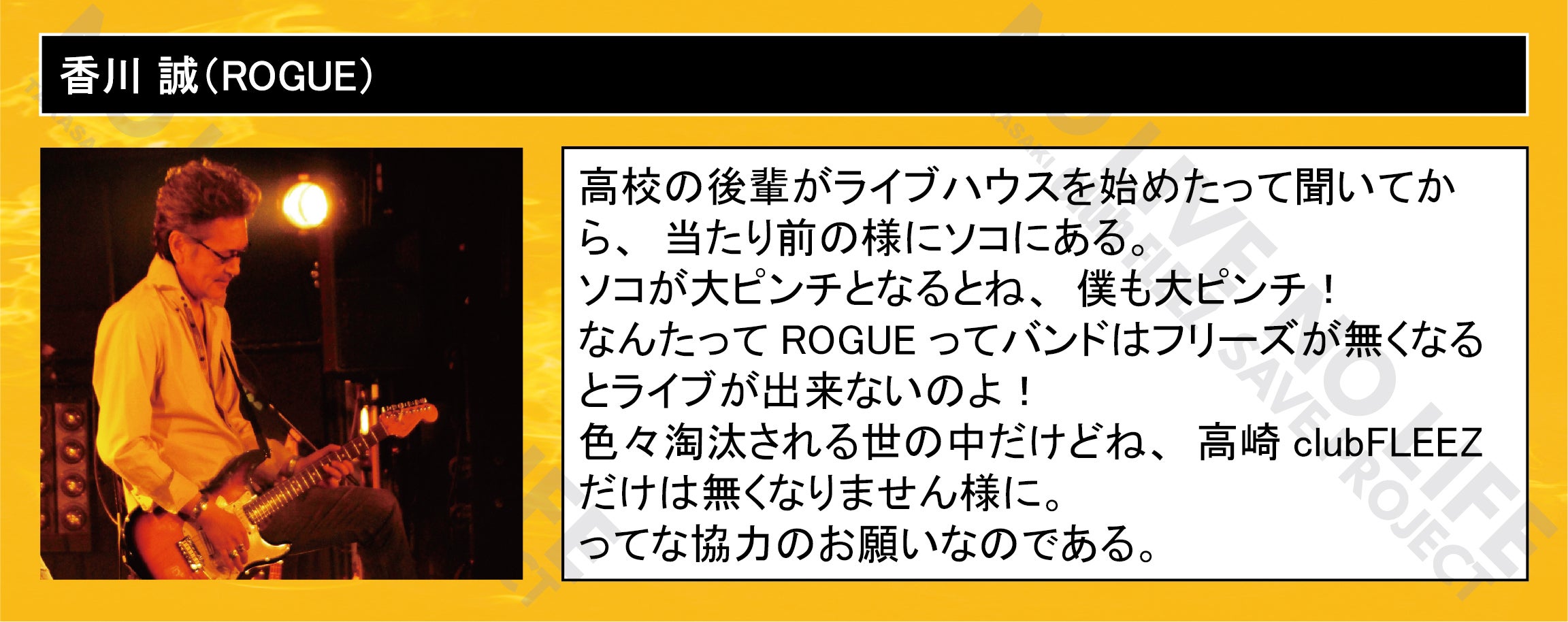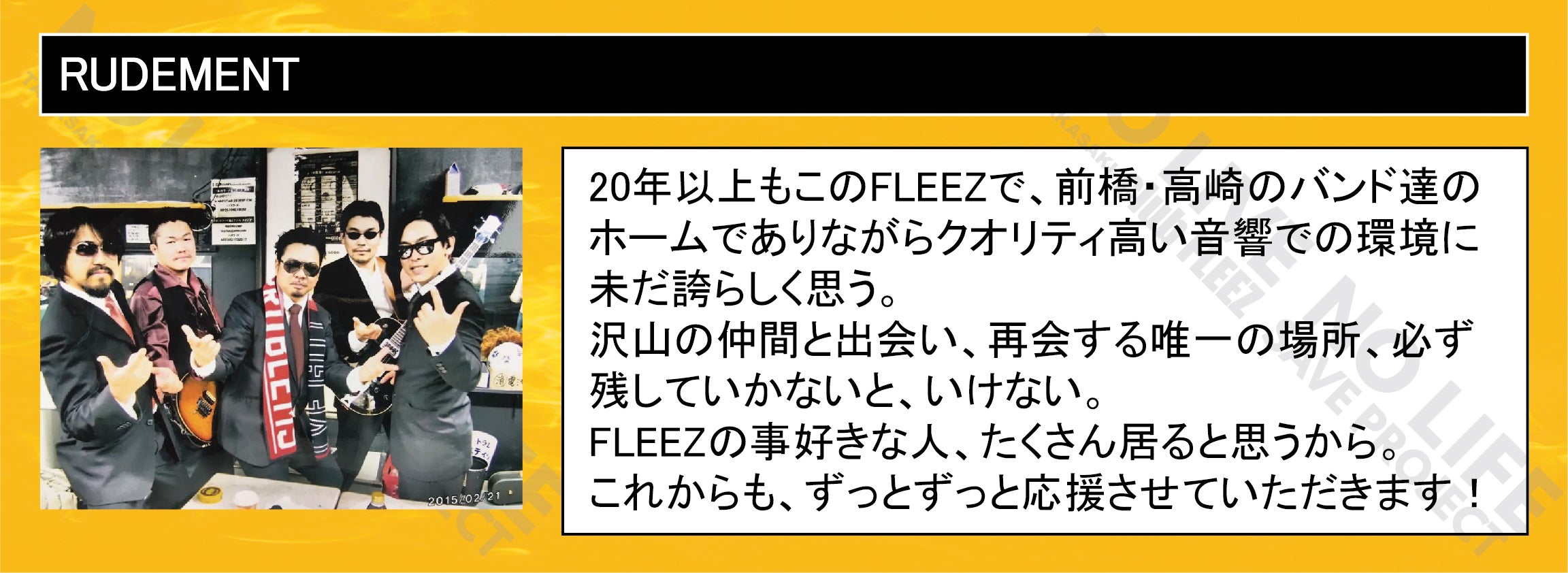 「 NO LIVE NO LIFE 」(ライブの無い人生なんて…)のタイトルどおりにミュージックフリーク、ライブフリークに提供して行ける場所を守りたい一心で今回のプロジェクトを立ち上げました。