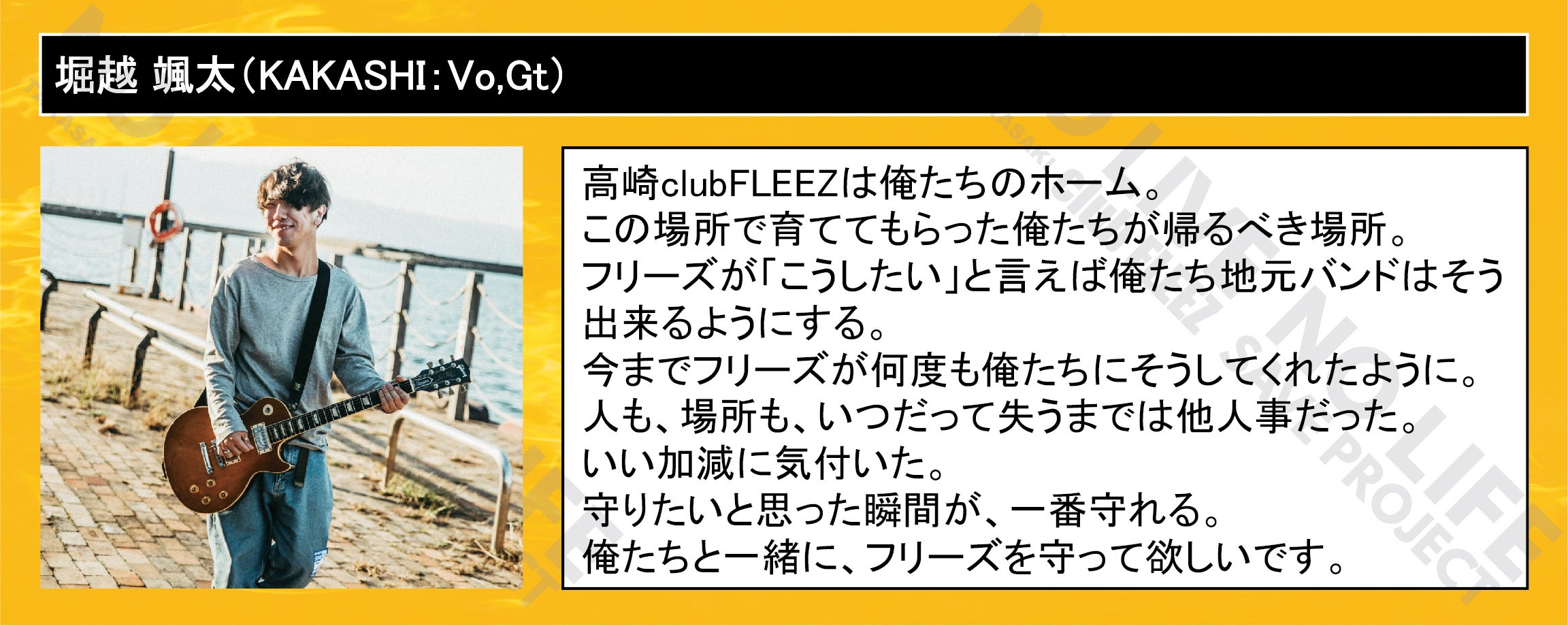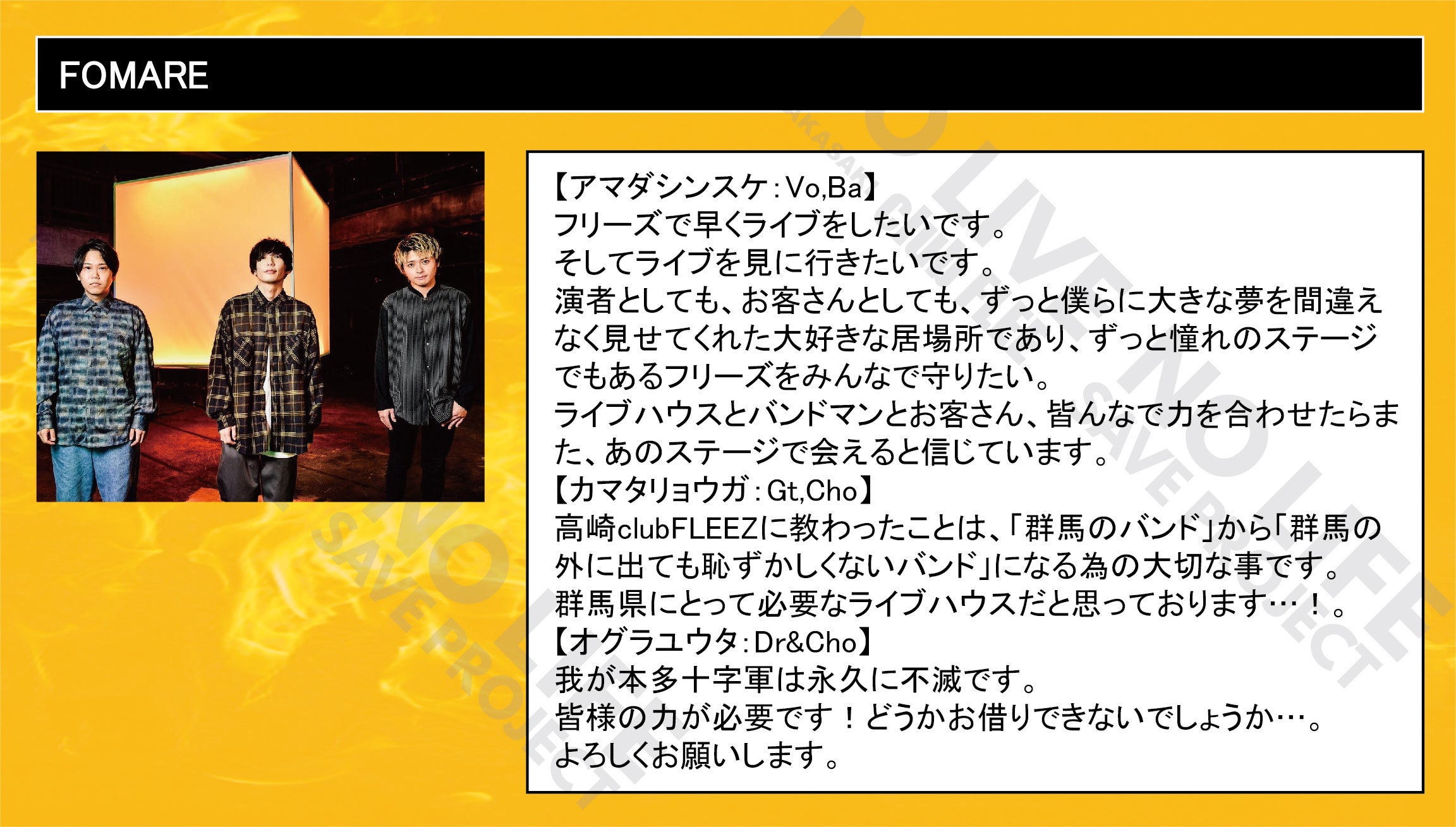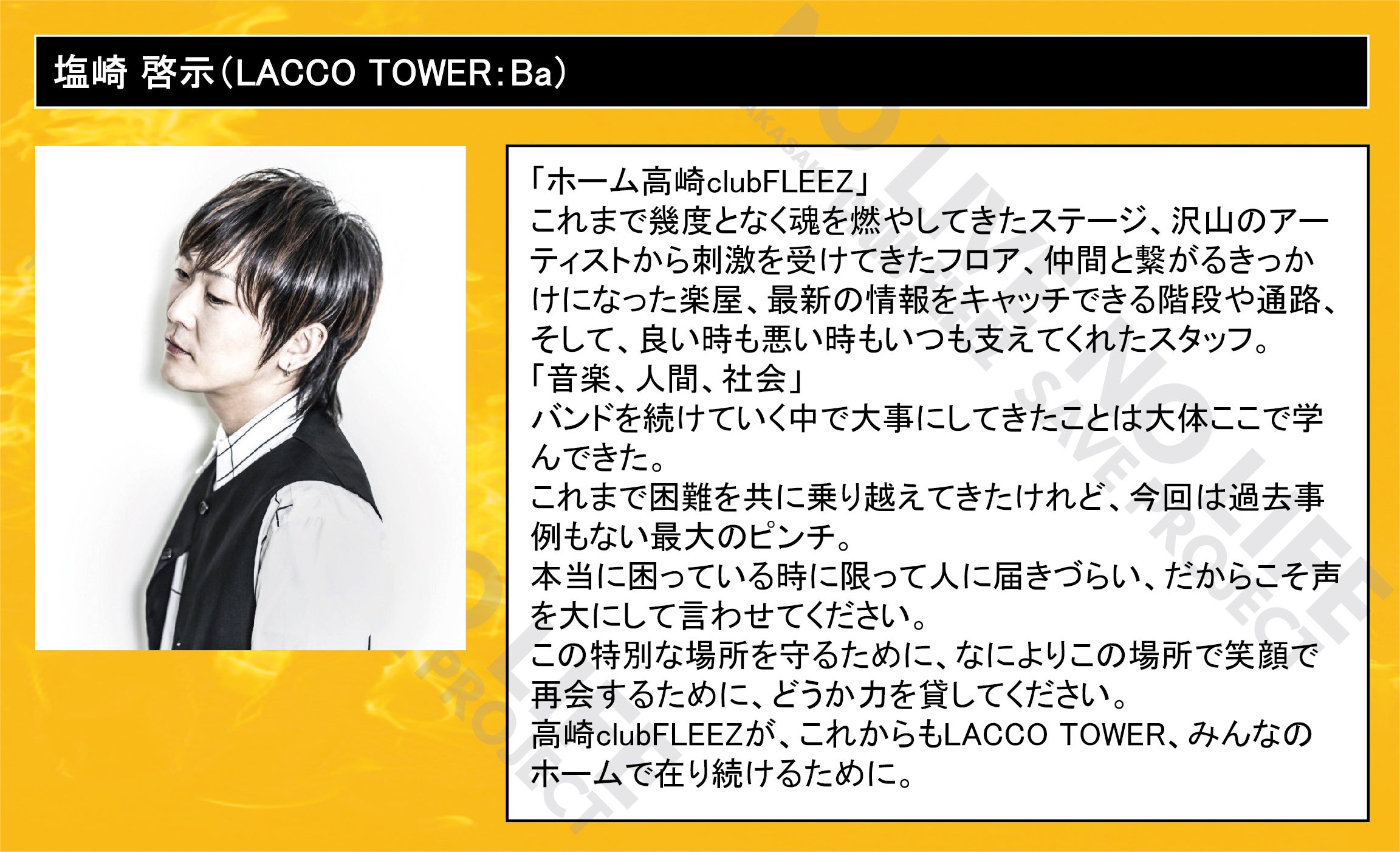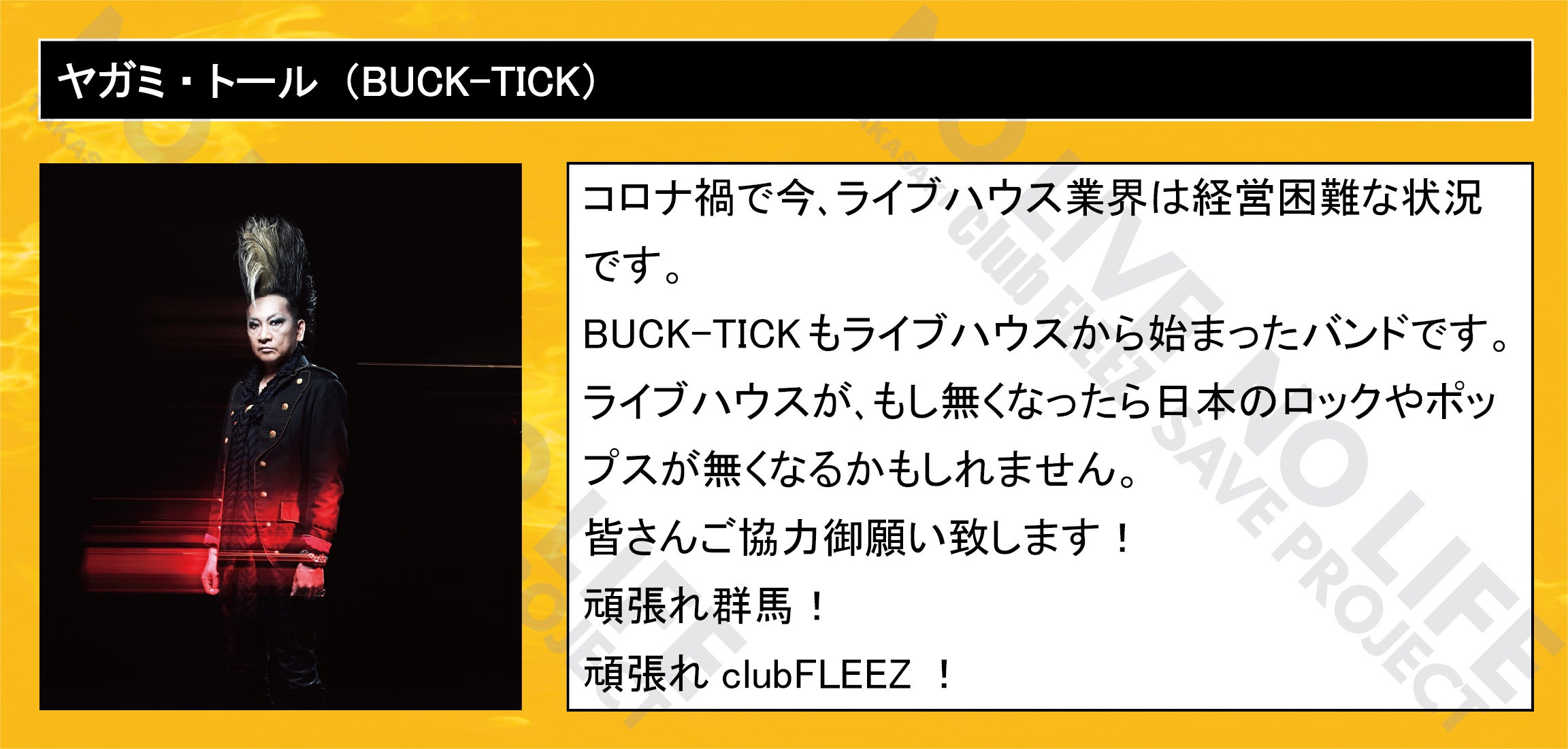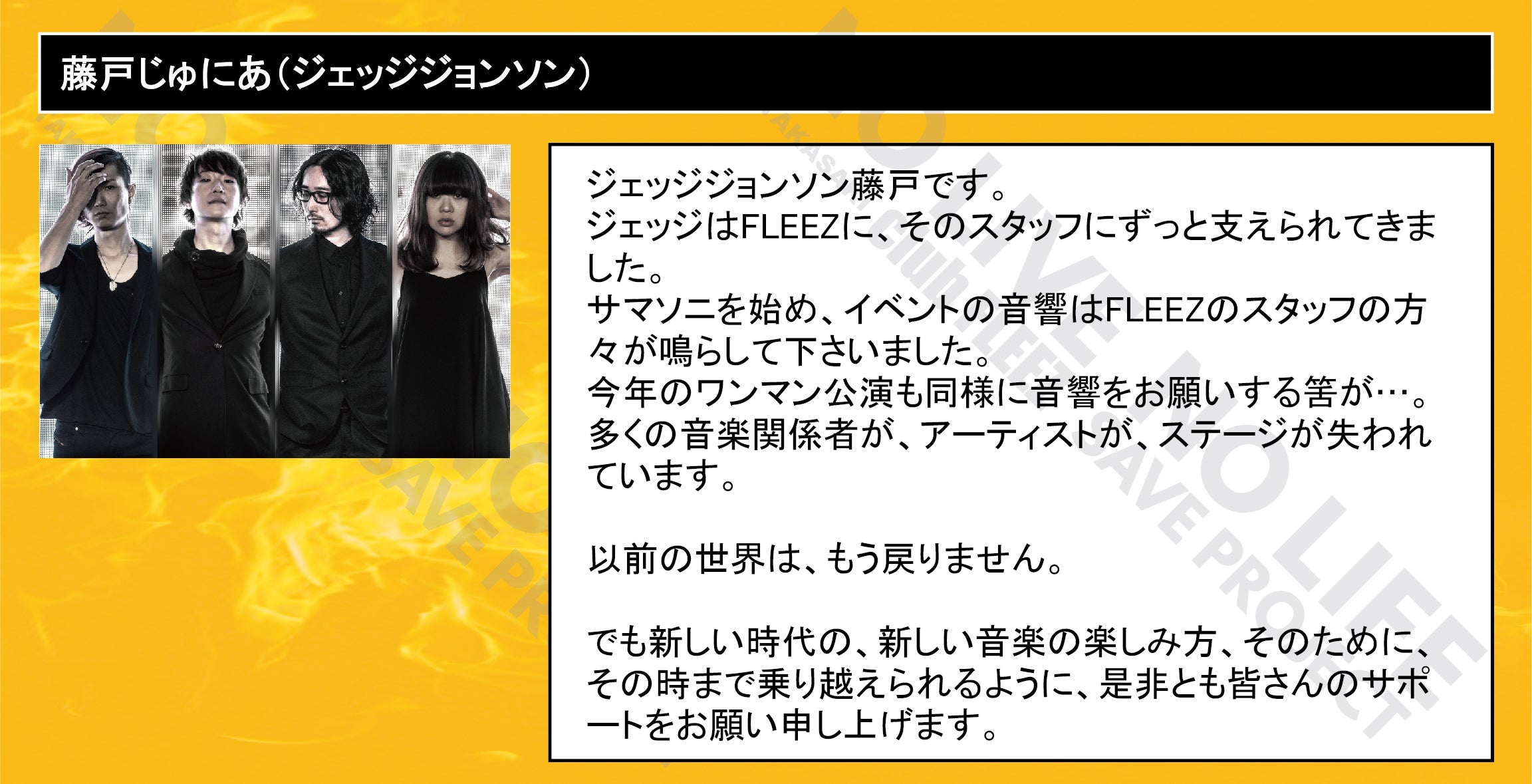 「 NO LIVE NO LIFE 」(ライブの無い人生なんて…)のタイトルどおりにミュージックフリーク、ライブフリークに提供して行ける場所を守りたい一心で今回のプロジェクトを立ち上げました。