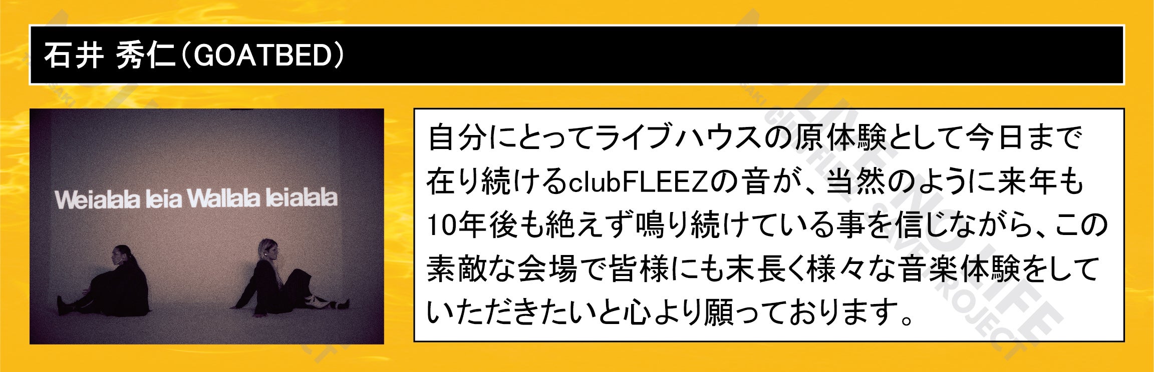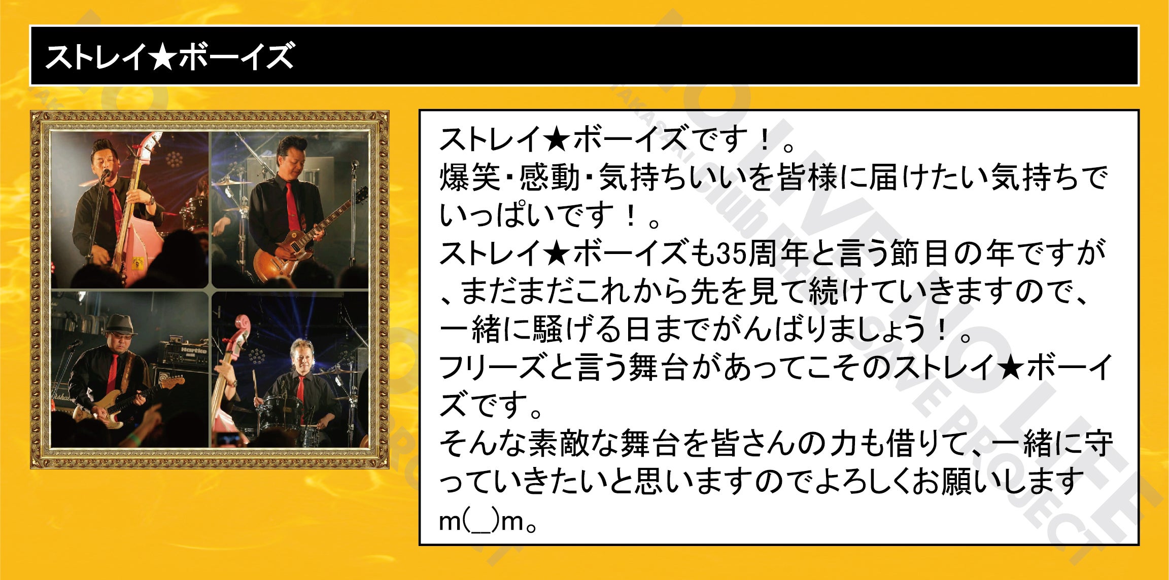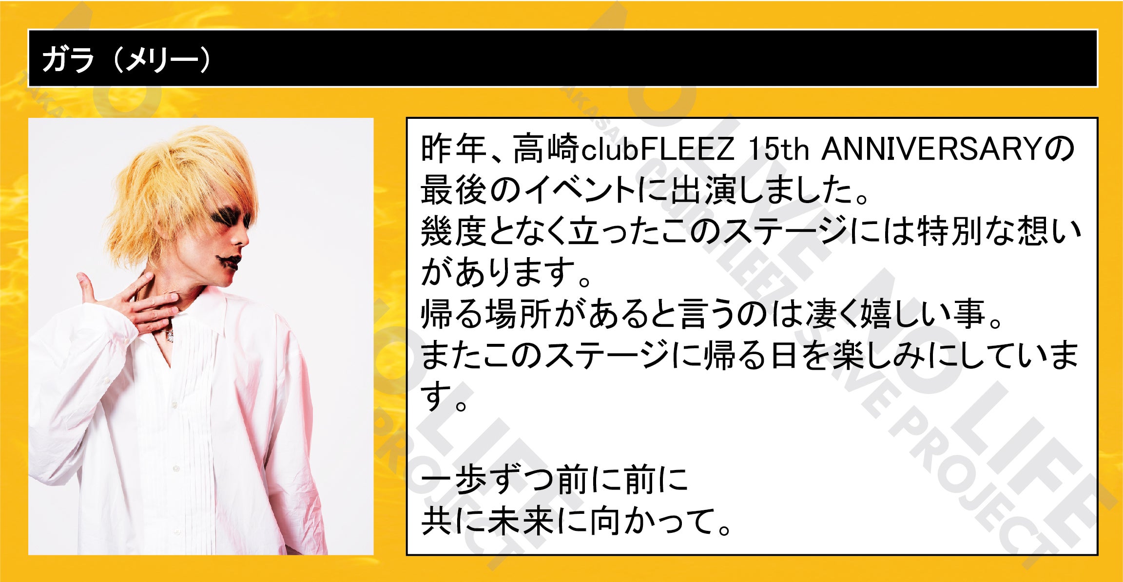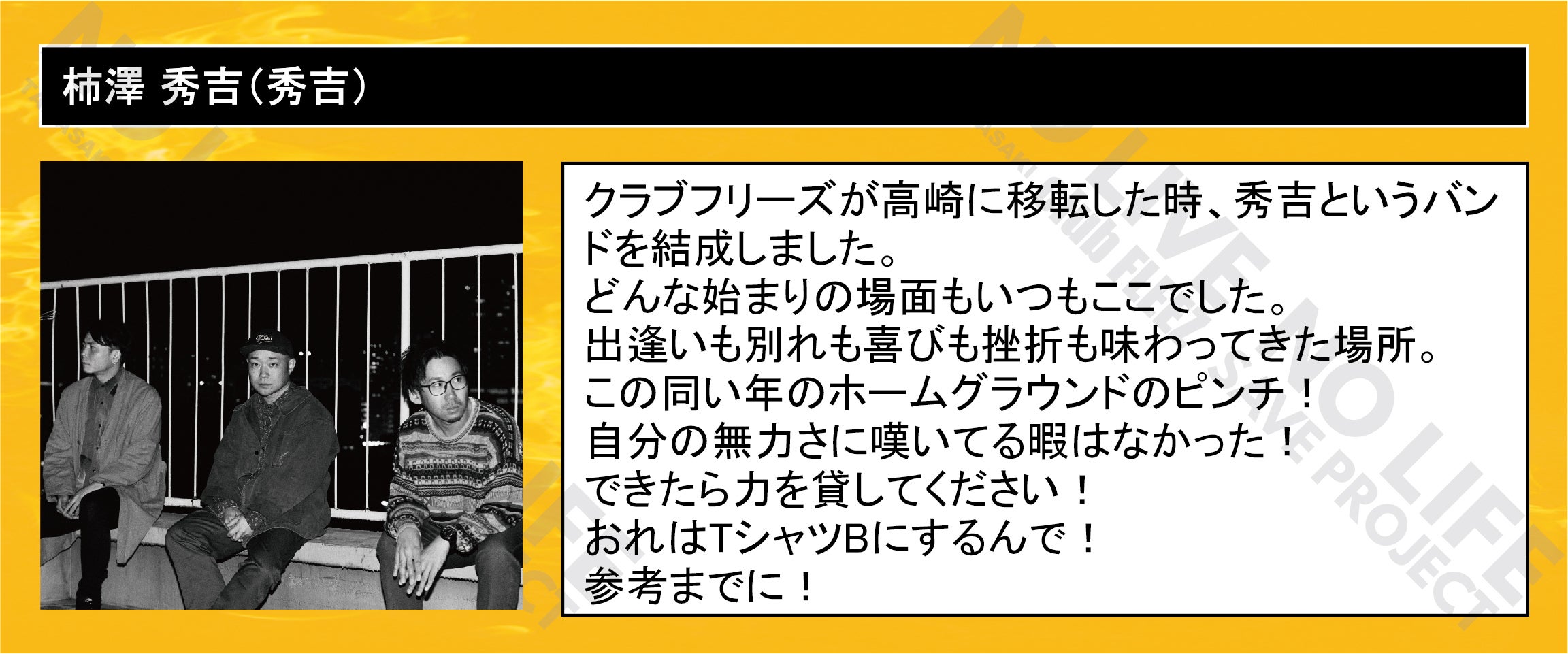 「 NO LIVE NO LIFE 」(ライブの無い人生なんて…)のタイトルどおりにミュージックフリーク、ライブフリークに提供して行ける場所を守りたい一心で今回のプロジェクトを立ち上げました。