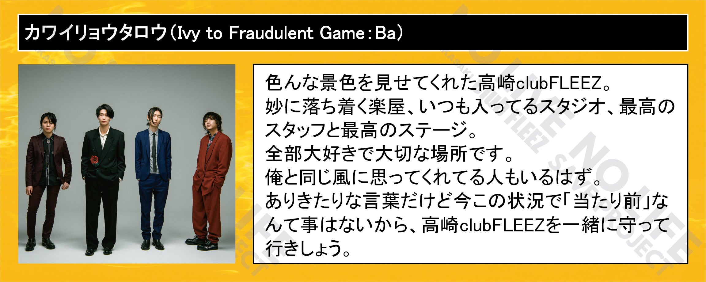 2020/10/26 22:27この度は「NO LIVE NO LIFE 高崎clubFLEEZ SAVE PROJECT」にご支援・ご協力、そして力強い応援を頂きありがとうございました!。「目標金額達成」「支援者数1249人」8/31より始動しましたこのプロジェクトも10/23終了時、皆様のおかげで予想を上回るゴールとなり、改めて温かいお力添えを感じさせて頂きました。また、多くのアーティスト様・スタッフ様・関係者様にご多忙の中ご協力を頂きました事を心より感謝申し上げます。今現在もまだ曇り空のエンタテインメント業界。ですが、このプロジェクトにより「皆様とのパワーがあれば必ず光差す世界を創る事が出来る」という事を確信させて頂きました。『 NO LIVE NO LIFE 』(ライブの無い人生なんて…)『BEATの聖地』を守るべく、そしてこれからも一人でも多くの人達が笑顔になる唯一無二の我々の空間『ライブハウス』を光差す未来に向け維持していく所存でございます。本当に本当に、ありがとうございました!。高崎clubFLEEZスタッフ一同 もっと見るクラウドファンディング終了のご報告