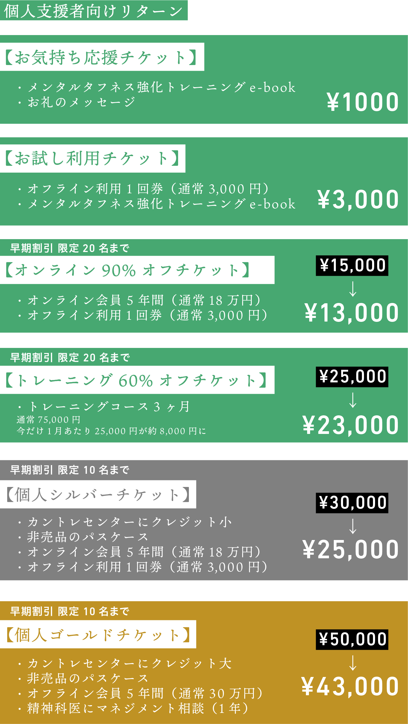 2021/01/30 11:30ご支援いただいている皆様この度は「カントレセンター」プロジェクトにご協力いただきありがとうございました。おかげさまで200万円もの支援を集めることができました。皆様一人一人の応援のおかげで達成できたこと本当にありがたく思います。リターンに関しては2月中旬以降プログラムを開始していきます。管理職のトレーニングを通じてメンタルの問題を解決する「カントレ」プロジェクトはこれからが始まりです。これから本格的に活動をしていきたいと思います。引き続きどうぞよろしくお願いいたします。伊井俊貴拝カントレセンターオープン、プレスリリースも出しました。お近くにお越しの際は是非お立ち寄りください!https://prtimes.jp/main/html/rd/p/000000017.000044720.html もっと見る新年のあいさつと管理職向けyoutubeチャネル開設のご報告