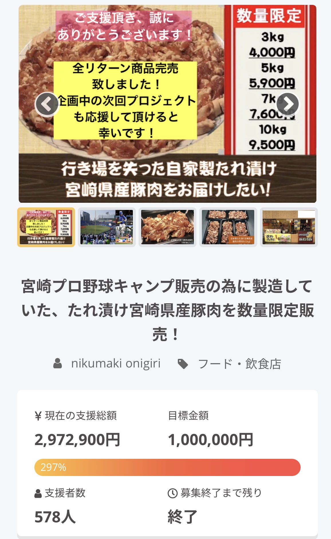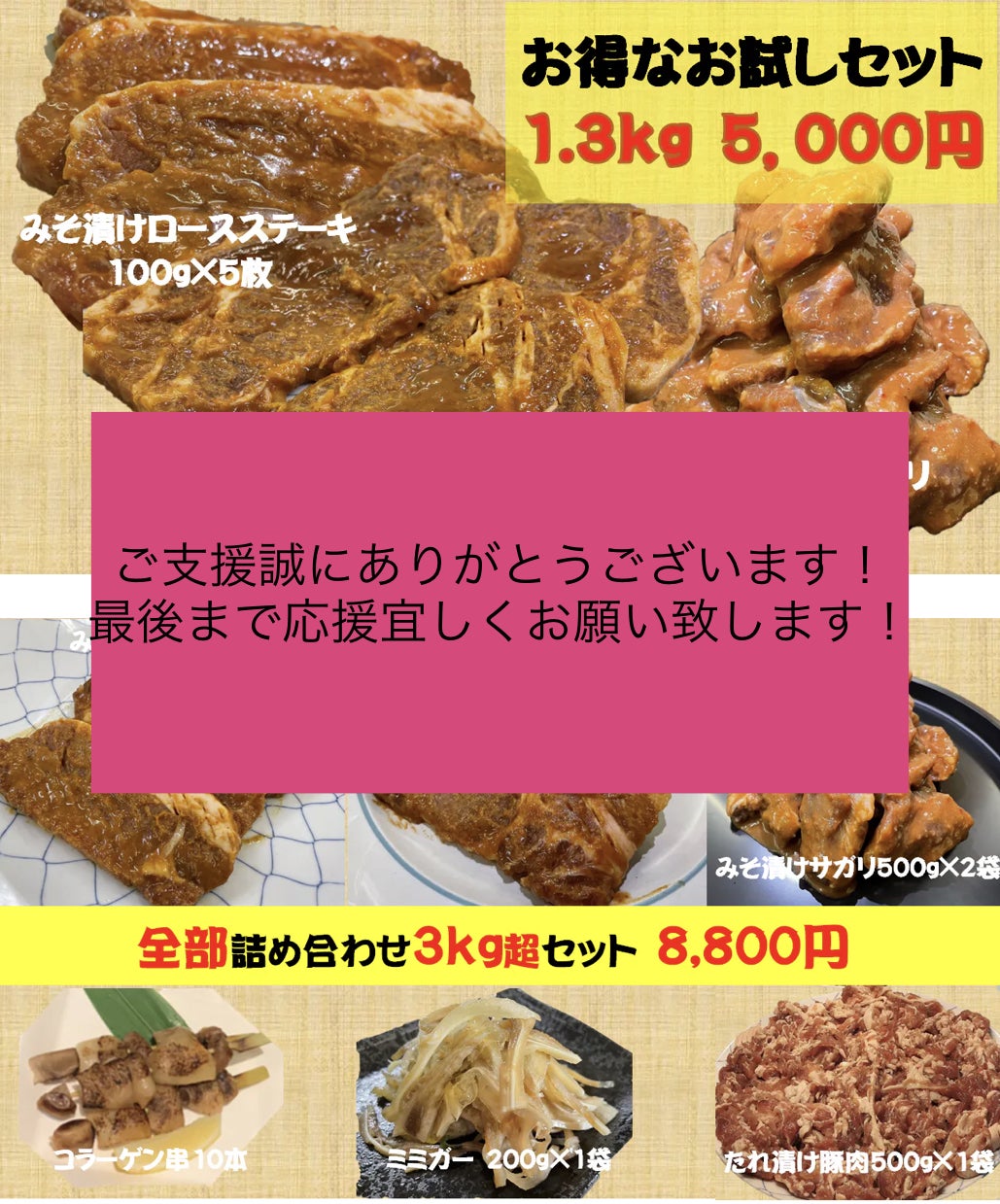 前回のプロジェクトで完売した自家製たれ漬け宮崎県産豚肉小間切れがセットになっているリターン商品もございます!是非ご覧下さい!
