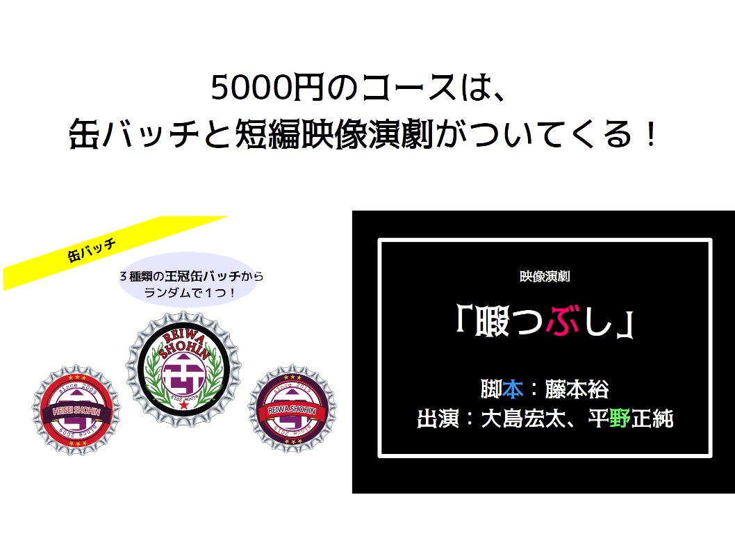 過去に上演した劇団令和商品(平成商品)オリジナルの脚本3作品のうち、1作品をお手元に届けます。