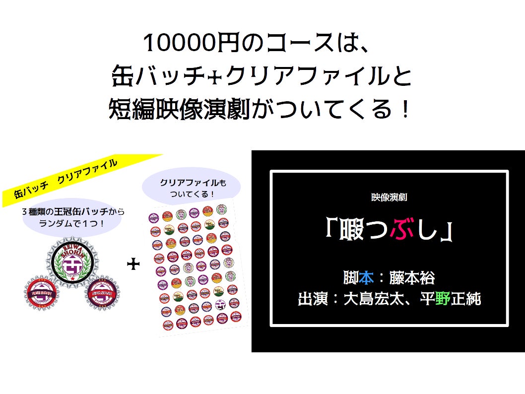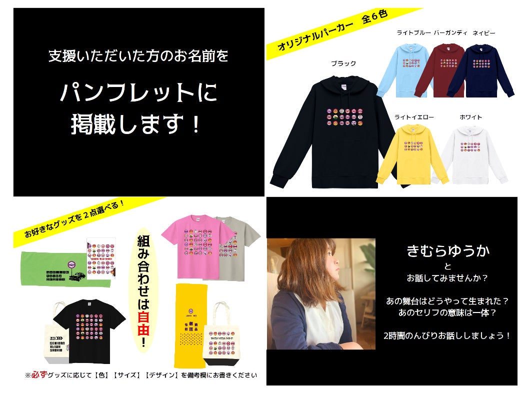 劇団員四名(大島宏太、きむらゆうか、平野正純、藤本裕)でご支援に対するリターン特典を用意しました。様々な内容を取り揃えましたので是非おたのしみください。
