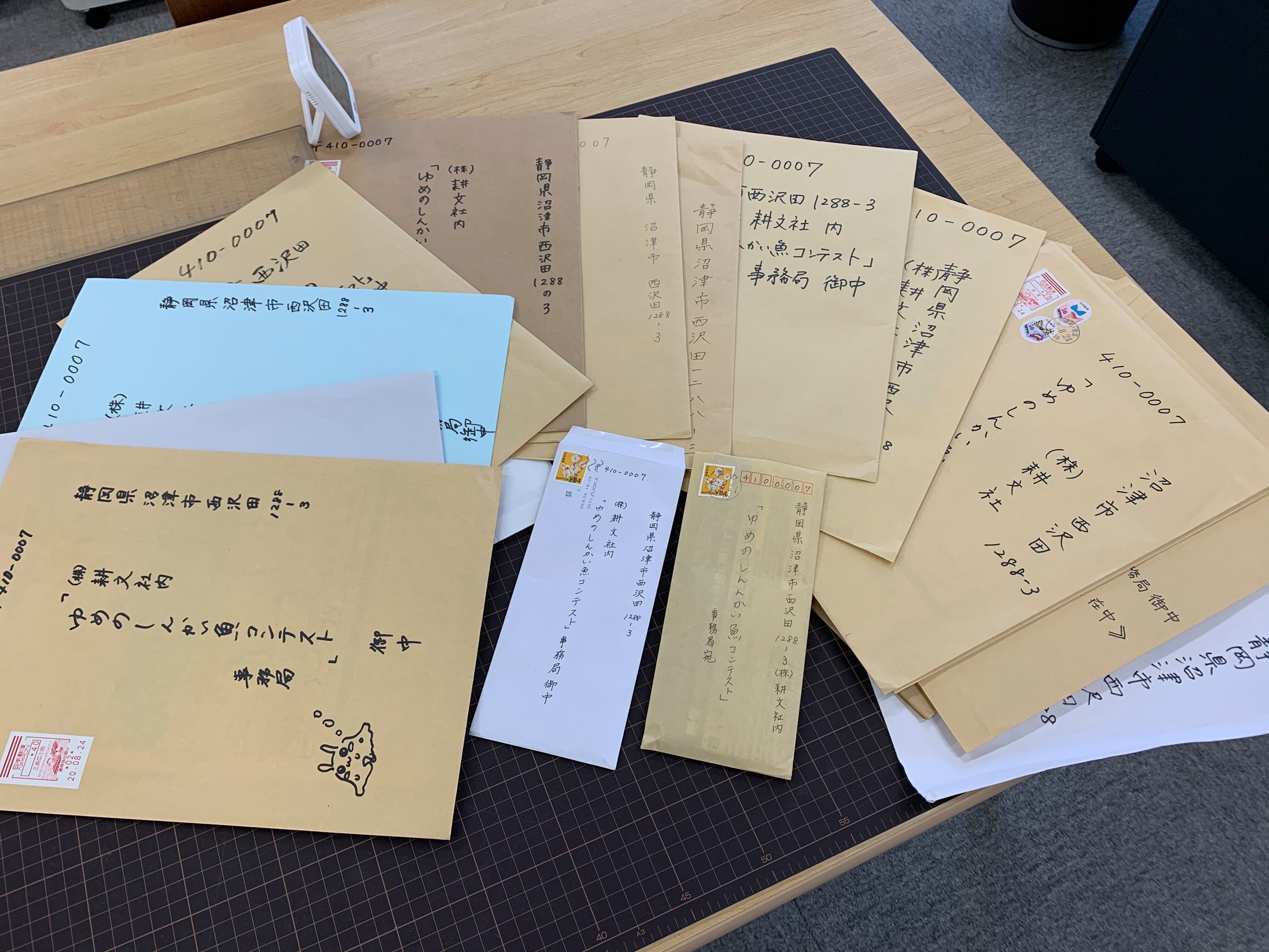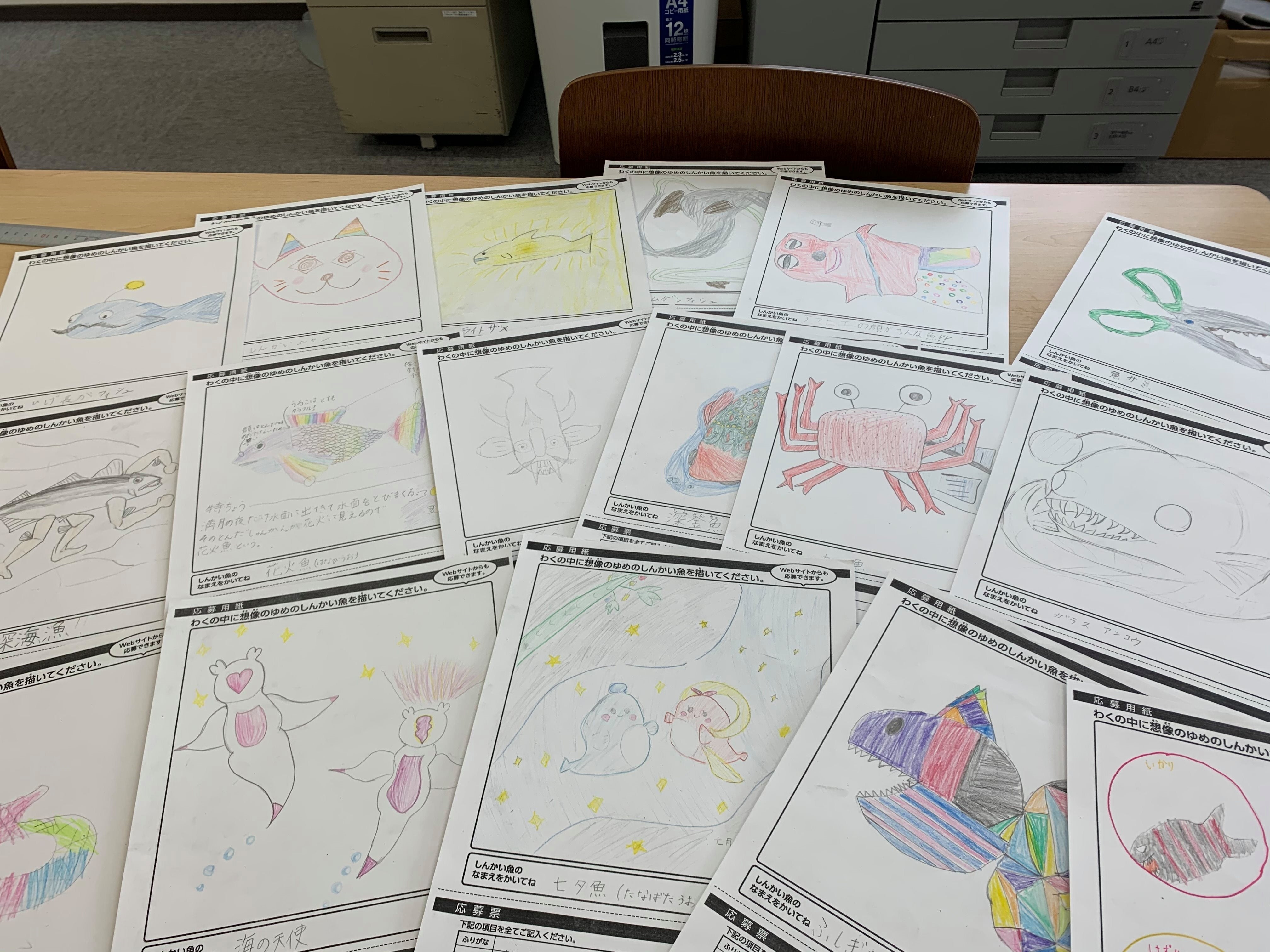 ご支援ありがとうございます、コンテスト実行委員会事務局です!いよいよ、ゆめのしんかい魚コンテストの応募最終日です!既に応募作品は400を超えました! ありがとうございます!郵送ではすでに今日最後の便が到着しました。残すはウェブ応募のみとなります。さて、今回届いた応募作品の中には、学校のクラス単位で送ってくれた人たちもいました!磐田市の小学校から送ってくださった、大橋先生にお話を伺いました。――このコンテストを知ったきっかけは何ですか?小学校の夏休みが明けた後、何か面白い宿題は出せないかなと、インターネットで探していた時に、新聞記事で見つけました。面白いなと思って、応募することにしました。――生徒さんからの反応はいかがでしたか?元々、私はクラスで応募作品を提出したり、生徒たちと応募することをよくしていました。ですので、すごく楽しそうに、「やるやる!」と前向きに取り組んでくれました。教室の前に投稿コーナーを設置し、他のクラスからの応募も増やそうとしていたと語った大橋先生。夏休みが明けてからの短い期間ですが、26作品が集まりました!大橋先生と生徒の皆さん、ありがとうございました!ゆめのしんかい魚コンテスト実行委員会事務局高橋聡