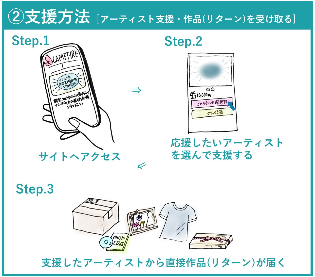 それぞれのアーティストの個性と魅力がたっぷりと詰まった作品(リターン)をアーティストから受け取ることが出来ます。