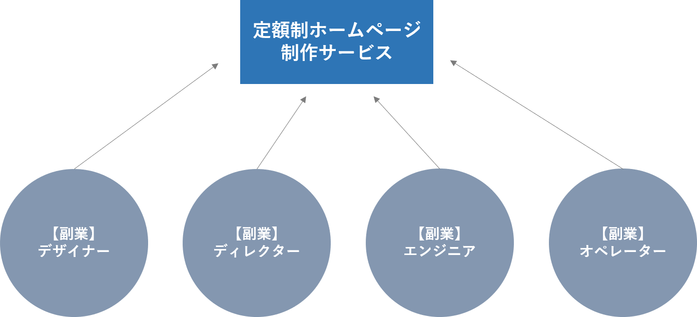 当社の殆どの関係者は副業として関わって頂いている方々であり、副業でしか出来ないサービスを展開することでより良い社会にしていくことを目指しています。