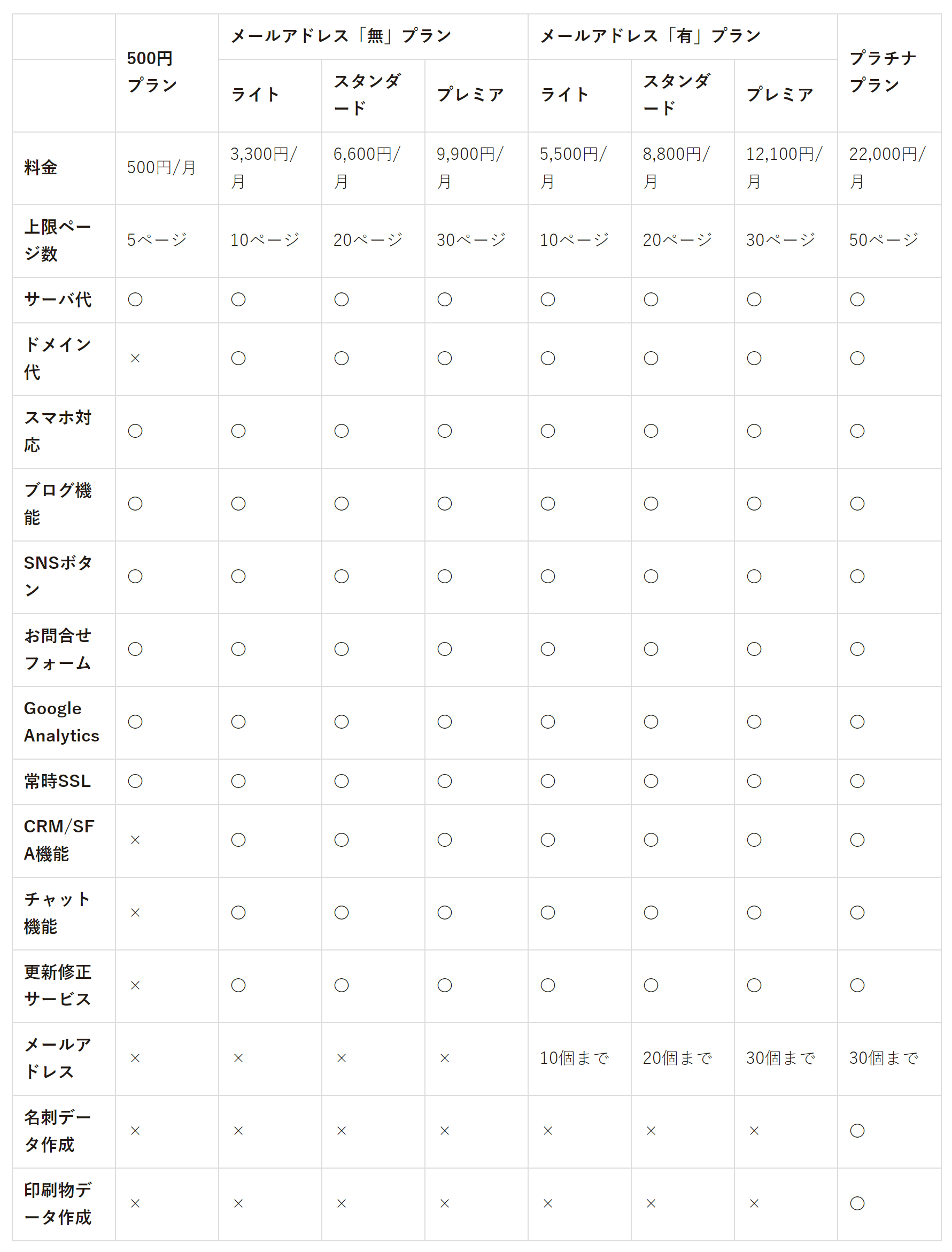 さらに、「常時SSL」「お問合せフォーム」などホームページに必要な基本的要素はすべて用意されています。また、月額3,300円のプランでは「チャット機能」「SFA/CRM機能」「更新・修正サービス」等にも対応し、幅広く対応しています。さらに、「プラチナプラン」では印刷物と名刺も制作します。