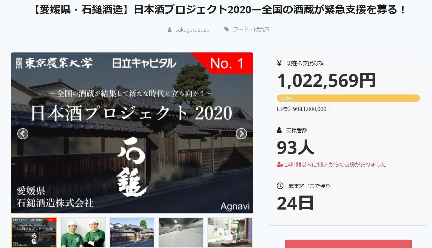 皆様この度は多くのご支援有難う御座います。「日本酒プロジェクト2020」におきまして、石鎚酒造様が目標額である100万円を突破致しました。感謝申し上げますプロジェクトは引き続き10月26日まで行います。引き続き宜しくお願いします。運営事務局