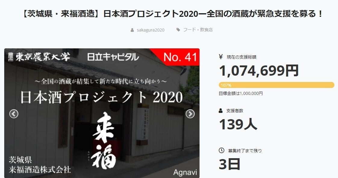 皆様この度は多くのご支援有難う御座います。「日本酒プロジェクト2020」におきまして、来福酒造株式会社様が目標額である100万円を突破致しました。感謝申し上げますプロジェクトは引き続き10月26日まで行います。引き続き宜しくお願いします。運営事務局