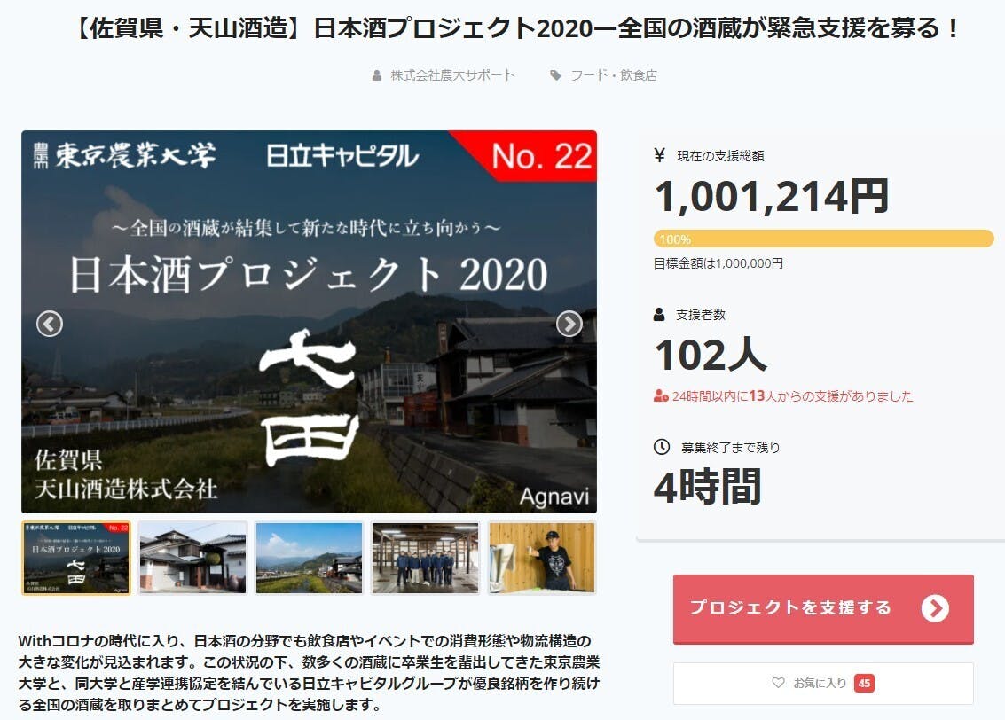 「日本酒プロジェクト2020」におきまして、天山酒造様が目標額である100万円を突破致しました。感謝申し上げます