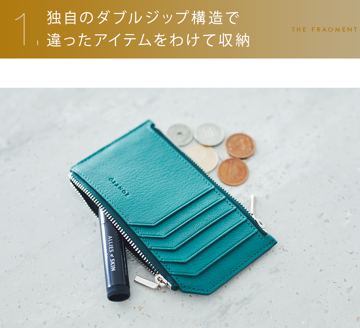 この問題を解決するアイディアが「上下にジップがあるダブルジップ構造」です。これによって小銭の取り出しやすさ+違ったアイテムの収納を可能にしました。