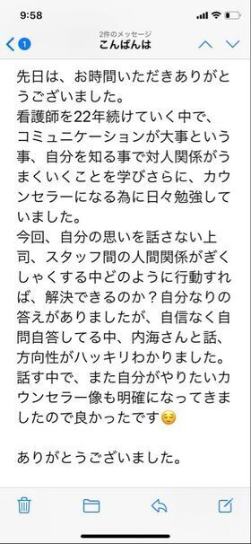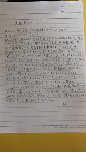 2020/10/20 09:00看護師さんへの無料カウンセリングをしました。看護師経験2年目で、緊急な援助を必要とする部署に勤務されていました。一般的に、1年目は先輩たちが目も手もかけてくれるのですが、2年目になるとそれが新採用者にいってしまいます。まだまだ不安もいっぱいな中、いろんな思いが巡ります。Mさんも、いろんな想いをもって仕事をされていました。看護師さんへのカウンセリングは、自分の想いも強くなってしまい、経験を話すことが増えてしまいます。カウンセリング後、繊細なMさんがしんどくなられなかったかなと心配になりました。お手紙で、同僚も同じようにしんどかったのを知って安心した、と書いてあり、少しでもMさんが楽になられたらいいなと、祈るような思いで読みました。なにか少しでもお役に立てれたら嬉しいです。Mさん、ありがとうございました。いつでも連絡してくださいね。*カウンセリングは守秘義務があるため、ご本人のOKをいただいた範囲のみ掲載しています。ご了承ください。 もっと見る