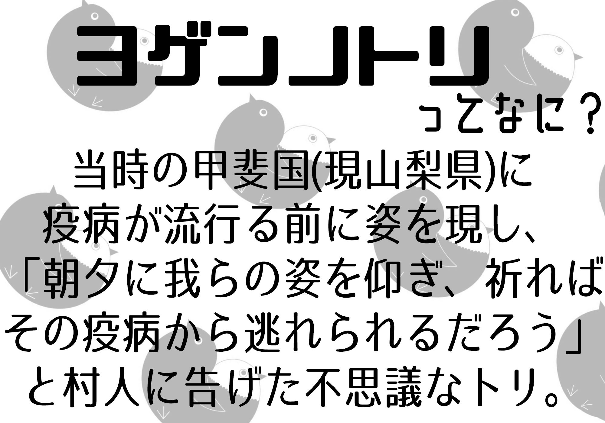 山梨県発、今日本でアマビエと同じく知名度を上げているのがこのヨゲンノトリです!