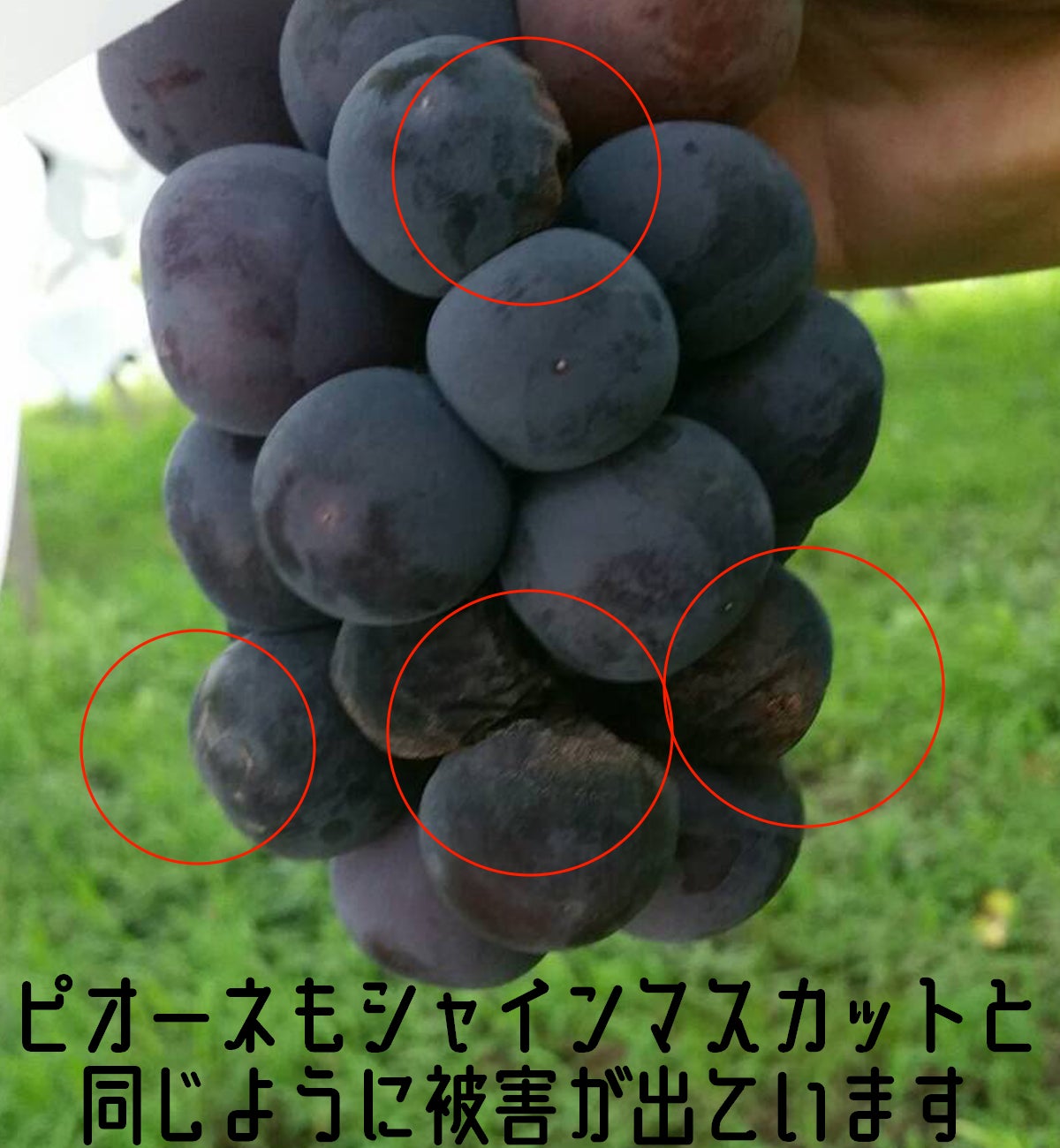 シャインマスカットの農家さんはピオーネも育てています。そして、ピオーネもシャインマスカットと同じように被害が出ています。毎年、瑞々しくておいしいピオーネを育ててくださっています。