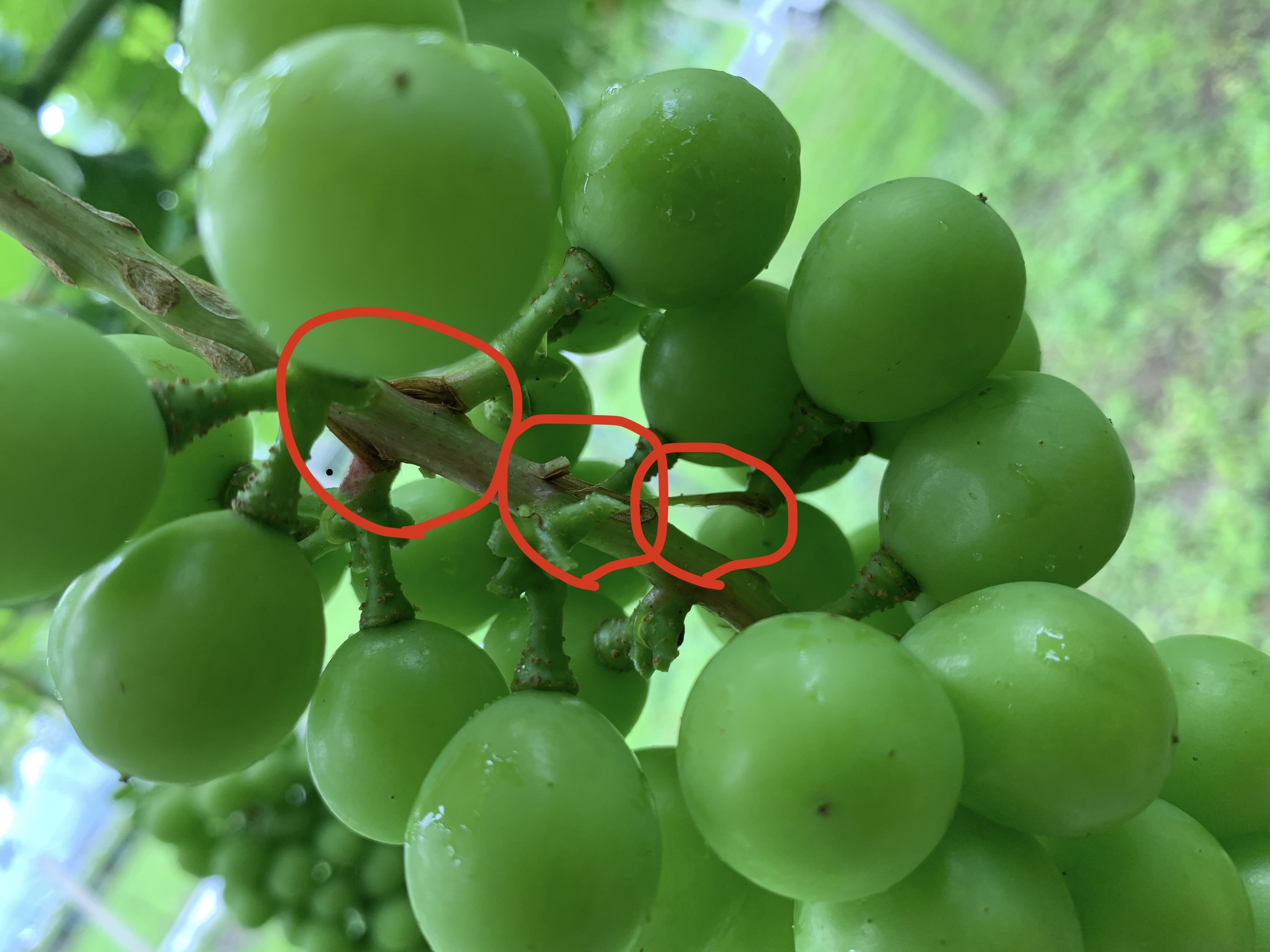 軸が裂けたぶどうです。こうなってしまうと順調な生育は出来ないので、切り落とすしかありません。