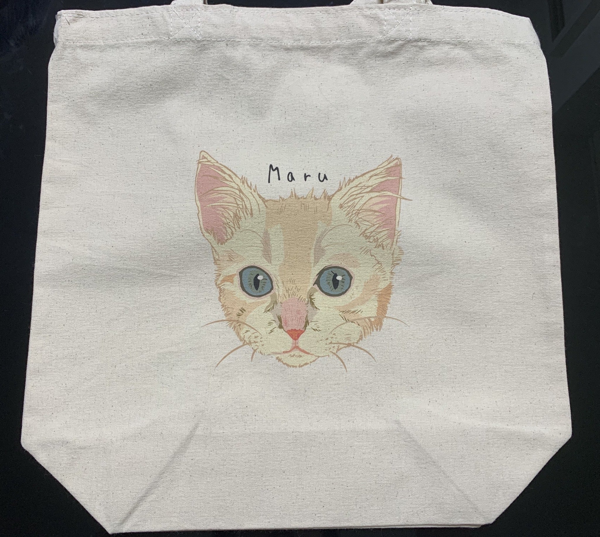 お礼メッセージカード、治療経過と活動報告、まるの写真、オリジナルカレンダー(ハガキサイズ)*3ヶ月分、オリジナルポーチ、オリジナルトートバック
