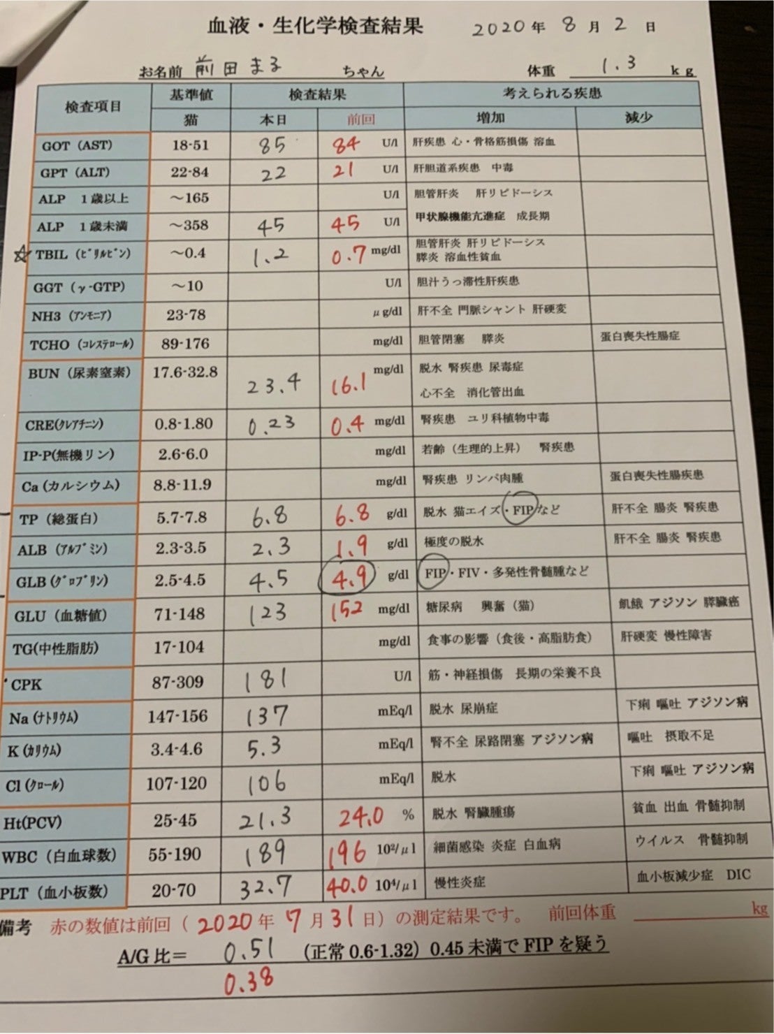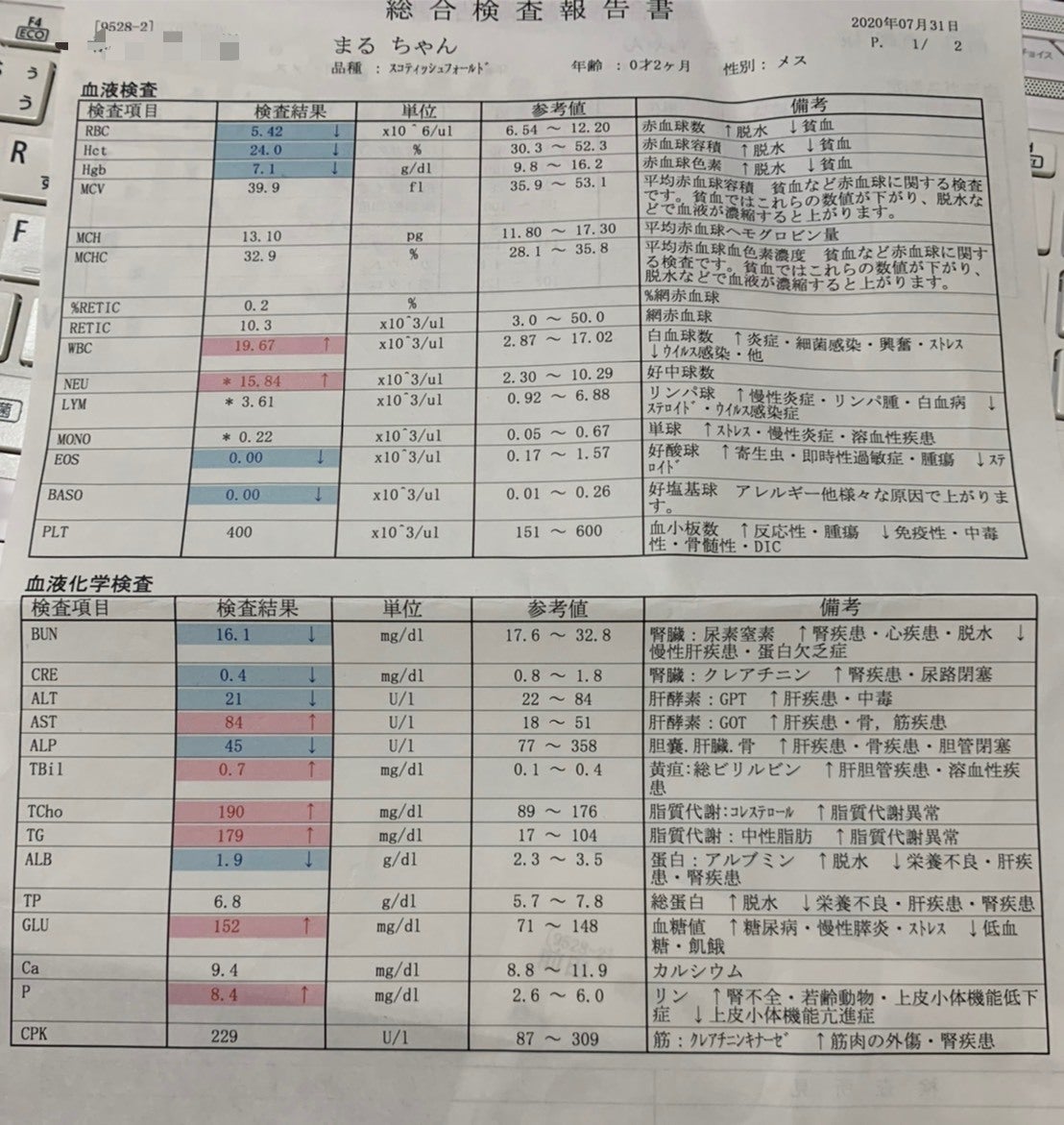7月31日 猫風邪の治療が終わり、治ったと思っていましたが、食欲がなく、体調が優れない様子だったので再度、受診。レントゲン、血液検査、エコーで検査を実施し、腹水が溜まっていることや血液検査結果からFIPを疑い検査機関からの結果を待つ。(この病気は進行が早いため、8月2日に協力病院を受診することにしました。)