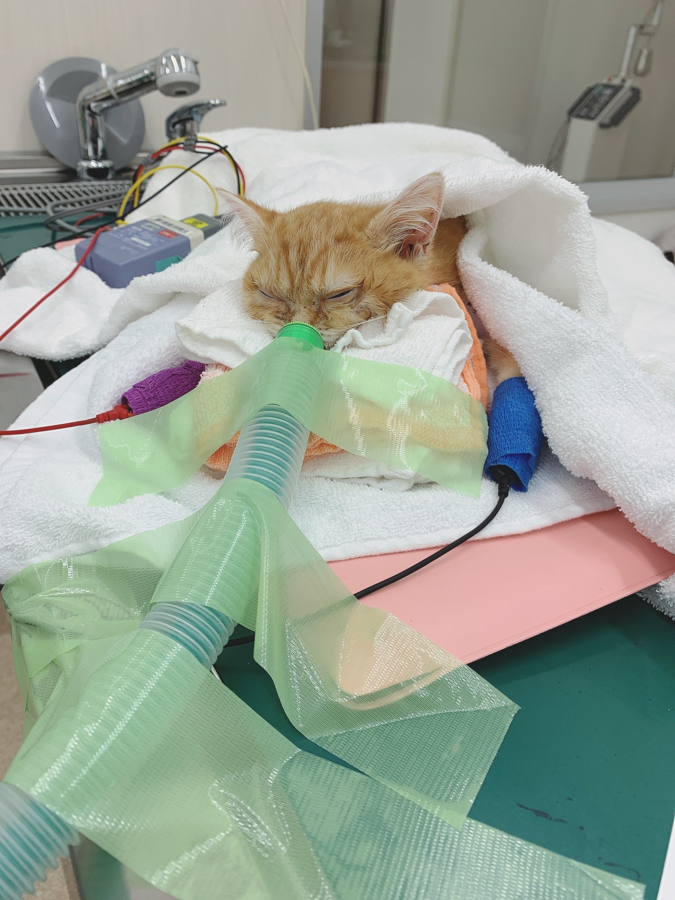 ある日、急に具合が悪くなり、病院で精密検査を受けると先天性の心臓奇形であることがわかりました。心臓が普通の猫ちゃんより大きいこと、心臓を4つに分ける壁に穴が空いていることなど、とても複雑な病気でした。