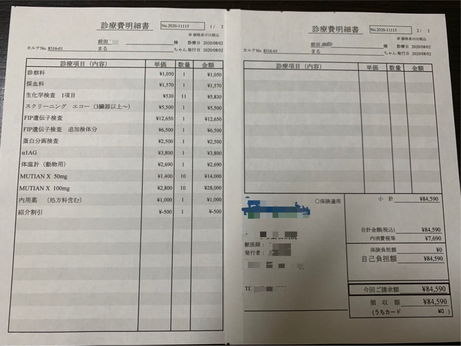 8月2日の検査を含めた診療費が約40,000円でした。今後も同様の診療が必要になるので、