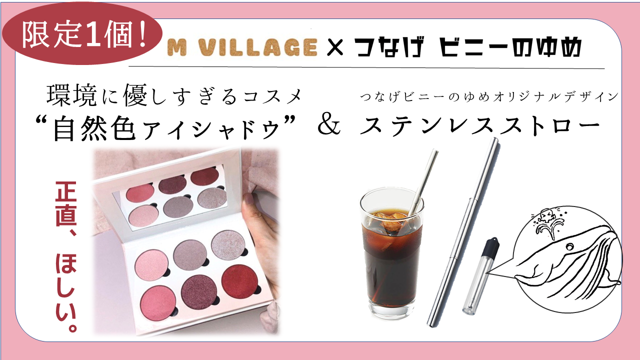 このプロジェクトを応援していただいている、M Villageさんより、環境に優しい化粧品『自然色アイシャドウ』をご提供いただきました!! なかなか入手できない貴重な圧倒的に環境に優しいアイシャドウです!限定1個です~~!お早めにっ!【M Villageさんからのコメント】「ほとんどの化粧品にはマイクロプラスチックという小さなプラスチックが入っていて、私たちは皮膚からプラスチックを吸収していると言われています。このアイシャドーにはマイクロプラスチックが入っておらず、また一色ずつ詰め替え可能になっています。身体にも地球にも優しく、きれいな色が出るアイシャドーを、ぜひ試してみてください!」【リーダー南からのコメント】「化粧品には実はマイクロプラスチックがたくさん含まれていて、それも海洋ゴミの一因となっています。このアイシャドウは完全にプラスチックフリーで、原材料も自然由来です。僕だったら彼女にプレゼントしたくなります!!(いないけどね...!)」【M Villageについて】双子の大学生、みほとりほで運営をしています。エコなものを買うことは、人の心身が健康でハッピーになるのはもちろん、気候変動の緩和に貢献できたり海の生物をプラスチックから守れたりハンドメイド&ごみゼロで土壌や大気汚染を防げたり動物を搾取から守れたり。他にもたくさんの環境や社会問題の解決に貢献できます。“普段の生活を見直してみることが解決への一歩だと1人でも多くの方に実感してもらえるような存在になっていきたいです。【ステンレスストローについて】伸縮して持ち運びに便利な、オリジナルデザインステンレスストローです。洗えて繰り返し使えるのでとってもサステナブル!コンパクトに収納できる&ケースには穴がついているので、キーホルダーにすることができ、「忘れちゃった!」なんてこともなく、日常の持ち運びに便利です!洗浄ブラシもついています。☆限定1個☆脱プラ×脱プラ革命是非チェックお願いします!!(^^♪