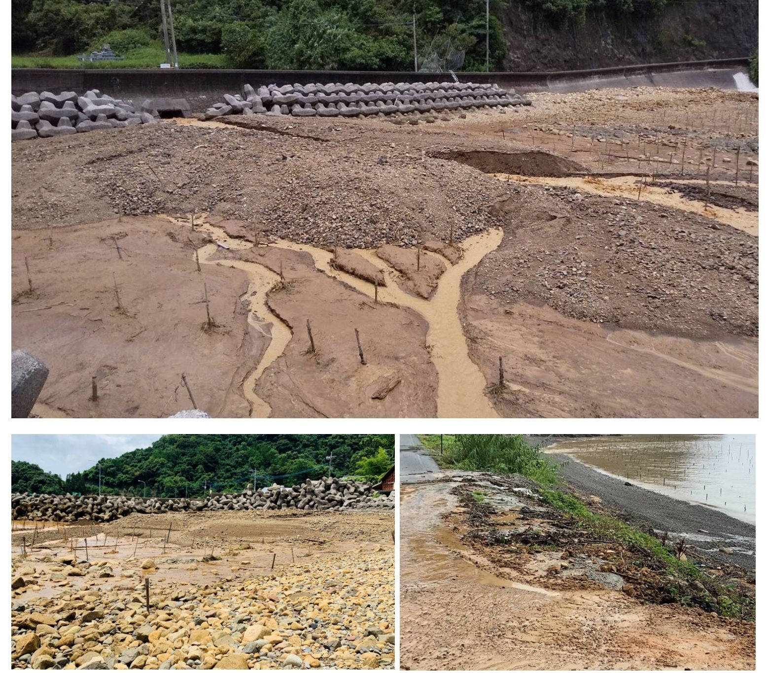 幸いにも土石流による怪我人は居ませんでしたが、その土砂が流れ込んだ海岸線に私たちのあおさのりの漁場があり、漁場は高さ3メートルにも及ぶ大量の土砂で埋まり、網を張り込むための杭もほどんどが折れてしまいました。人の力ではどうすることもできない状況で、町役場の試算では被害総額6,000万円に及ぶと言われています。
