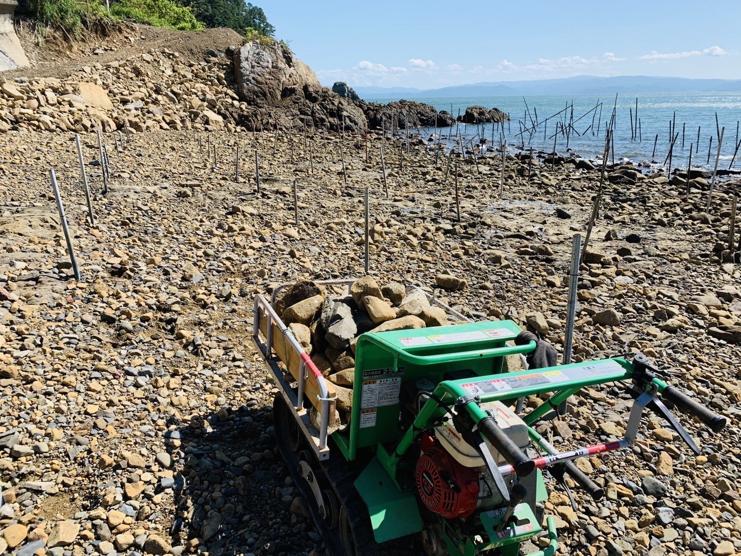 2020/09/27 18:23ご支援頂いた皆様、本当にありがとうございます。本プロジェクトも残り3日となりました。引き続き、応援の程宜しくお願い致します。昨日9月26日より獅子島のあおさのり生産者の「菌取り」がスタートしました。先日から海水温が一気に下がったこともあり、あおさのりの赤ちゃん≒「菌」が海岸線に漂流、岩にもあおさのりの菌が付着し、緑のコケのようになっています。朝から潮が引くのを待って、皆一斉にあおさのりの養殖網を張り込んでいきました。他の集落の菌取りの様子これが、獅子島の秋から春先にかけた風物詩ともいえる、海岸線に広がる”緑の絨毯”です。ターコイズグリーンの網がぎっしり敷き詰められた海岸線は、非常にきれいです。しかし、私たちはまだまだ漁場の復旧作業を継続中です。菌取りは先に張り込んだ網に多くの菌が付着することがわかっていますので、我々の集落では台風10号の被害も考慮し、業者間で話し合い、10月3日に一斉に張り込むこととなりました。この決定は、私たちにとっては復旧作業の時間が増えるためうれしい反面、菌取りのスタートを後倒ししたことでその機会が少なくなるため、土砂が堆積し生態系が変わったかもしれない漁場での菌取りを失敗した場合のリカバリーができなくなるという不安要素でもあります。漁場の復旧が100%でなくても、早くから菌取りを開始したかったというのが本音でした。そんな中、本日は、菌取りの網を張る場所に散乱している大き目の岩の撤去作業を行いました。岩が残っていると、網が破れる上、せっかく網に付着したあおさのりの赤ちゃんが擦れて剥がれてしまうからです。数えきれないほどの岩を撤去しましたが、まだまだ終わりが見えません。以前、農機具屋さんから購入した、この運搬機が非常に役に立っています。彼のお陰で、本日は写真にある一列目の撤去を完了させました。明日からもこの作業と杭打ち作業の連続です。涼しくなったとはいえ、風の全くない海岸線で直射日光を浴びながらの重労働はさすがにこたえます。さぁ、明日から潮が起きます(干満の差が最大化する大潮に向けて潮が動き出す)。潮が大きく引くので作業時間も長くとれます。先日の杭打ちでハンマーに叩かれた左手の親指も腫れたままで痛みが引きませんが、テーピングでガチガチにして、ラストスパート頑張ります。絶対にあきらめない!来シーズンも「おいしい、あおさのり」を必ず皆さんの食卓にお届けします! もっと見る