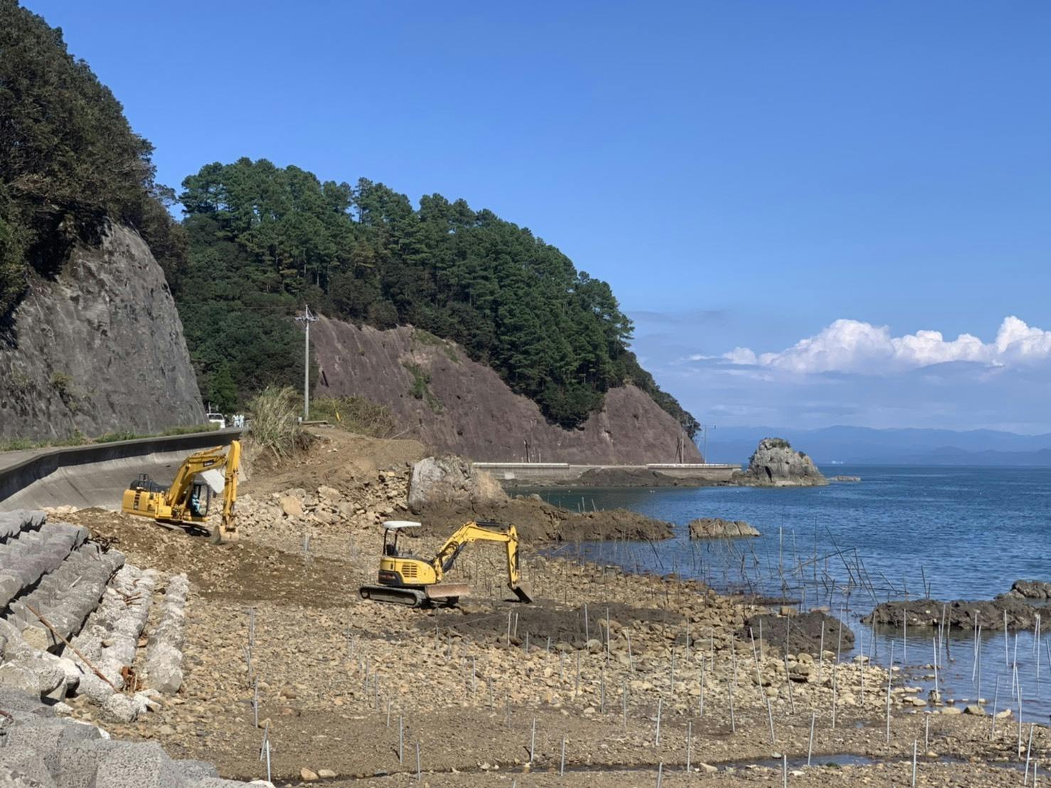 2020/09/16 00:35しばらく投稿ができておらず、申し訳ありません。記録的な強さの台風10号でしたが、進路付近にお住まいの皆様はお怪我ありませんでしたか?我々が住む獅子島も事前に出来うる備えをしておいたので、人的被害は全く無く、みな無事でした。一方、漁場には大きな爪痕を残して過ぎ去っていきました・・・。このプロジェクトでご支援をお願いしていた漁場(写真手前)については、大きな被害はなく、台風の高波により漁場が洗われ、先日まで堆積していた粘土状の泥がほとんど流されていました。台風前に打ち込んだ杭もほとんどまっすぐ残っています。一方、写真奥の漁場が再び大きな被害を受けてしまいました。高波対策として、杭に支えをつけて補強したのですが意味をなさず、南から南東にかけての強い風と高波によりほとんどの杭がお辞儀状態、支えも一本を残して見事に折られていました。 また、重機の出口として作った導線に積み上げた岩や土が高波により漁場に引きずりこまれ、再び埋もれてしまいました。現在重機を使って、土砂を取り除いておりますが、9月末の菌取りに間に合うのか・・・・。再び台風が来ることがないように願うばかりです。クラウドファンディングも残り約2週間となりました。引き続き、ご支援の程宜しくお願い致します。 もっと見る
