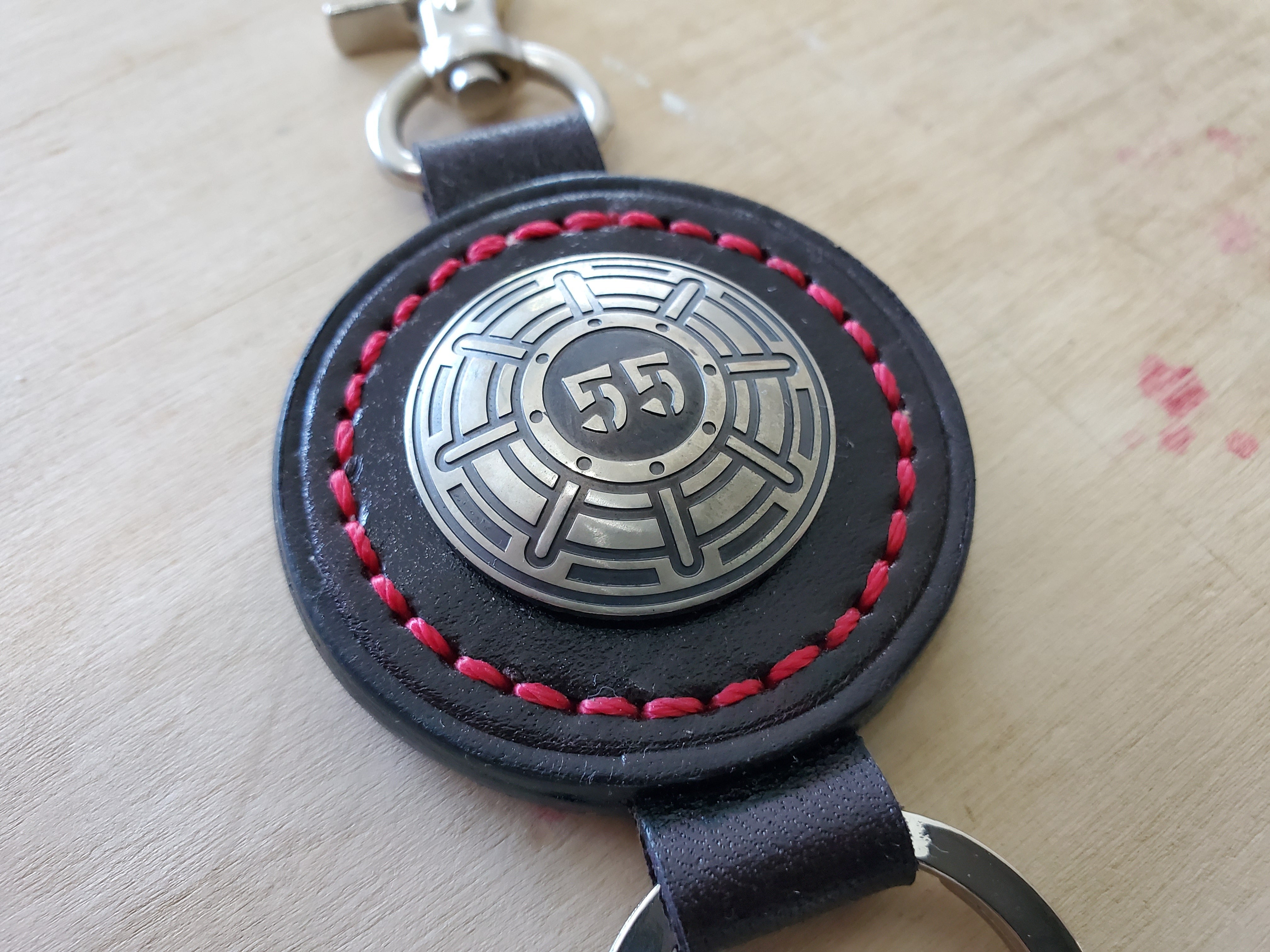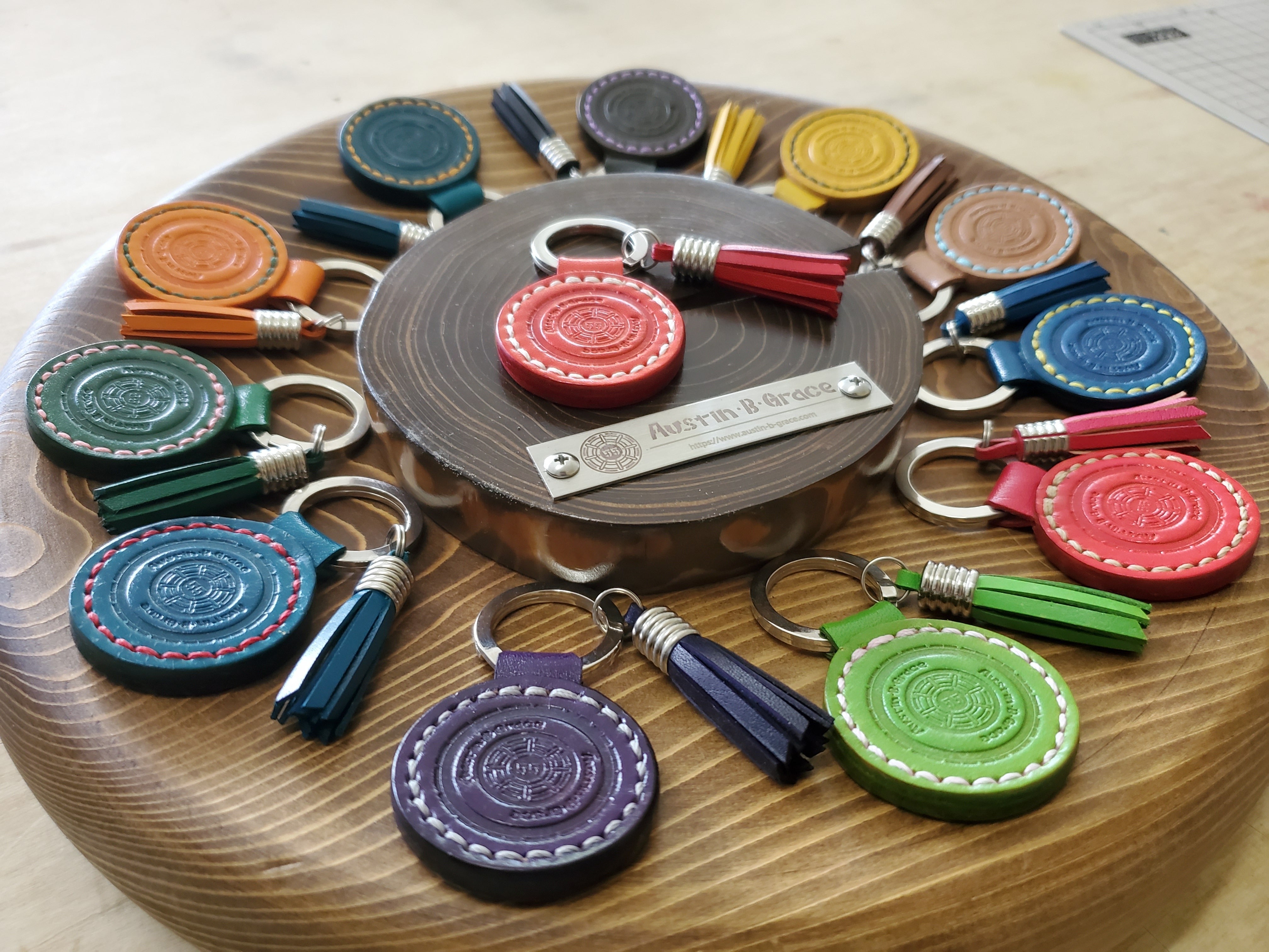 本日はリターン商品、「ABGクリアファイル&キャラクター本革キーホルダーセット」の「本革キーホルダー」についてご紹介します !こちらは牛革のタンローを使用し、キャラクターカラーに染色した本革キーホルダーです。本体は厚み6mm、直径40mmの本革を使用し、20mmのダブルリングと、同じく本革で製作したミニタッセルがついています。本体の刻印部分の革は、「2mm×2mm×2mm」の合計3枚の革を貼り合わせ、キャラクターカラーのポリエステルボンド糸を使用し、すべて手縫いで仕上げています。販売価格は税込3,300円になる予定ですが、1枚の大きな革から裁断し、染色、刻印、縫製に至るまで、すべて一つ一つ手作業で行っています。1つのキーホルダーが完成するまでには、染色後の乾燥時間もあるため、3日~5日ほどかかります。もちろん数個並行して製作しているため、1つ完成するのに3日~5日ではありませんが、機械のように1日に何百、何千個も製作できるものではありません。一度に量産はできないため、その分品質にこだわり一つ一つ丁寧に仕上げています。こちらの商品は鮮やかな12色のポップカラーに身を包んだ、見た目にも楽しい遊び心満載の本革キーホルダーです。只今パッケージも製作中。後日またご紹介いたします。引き続き応援宜しくお願い致します。