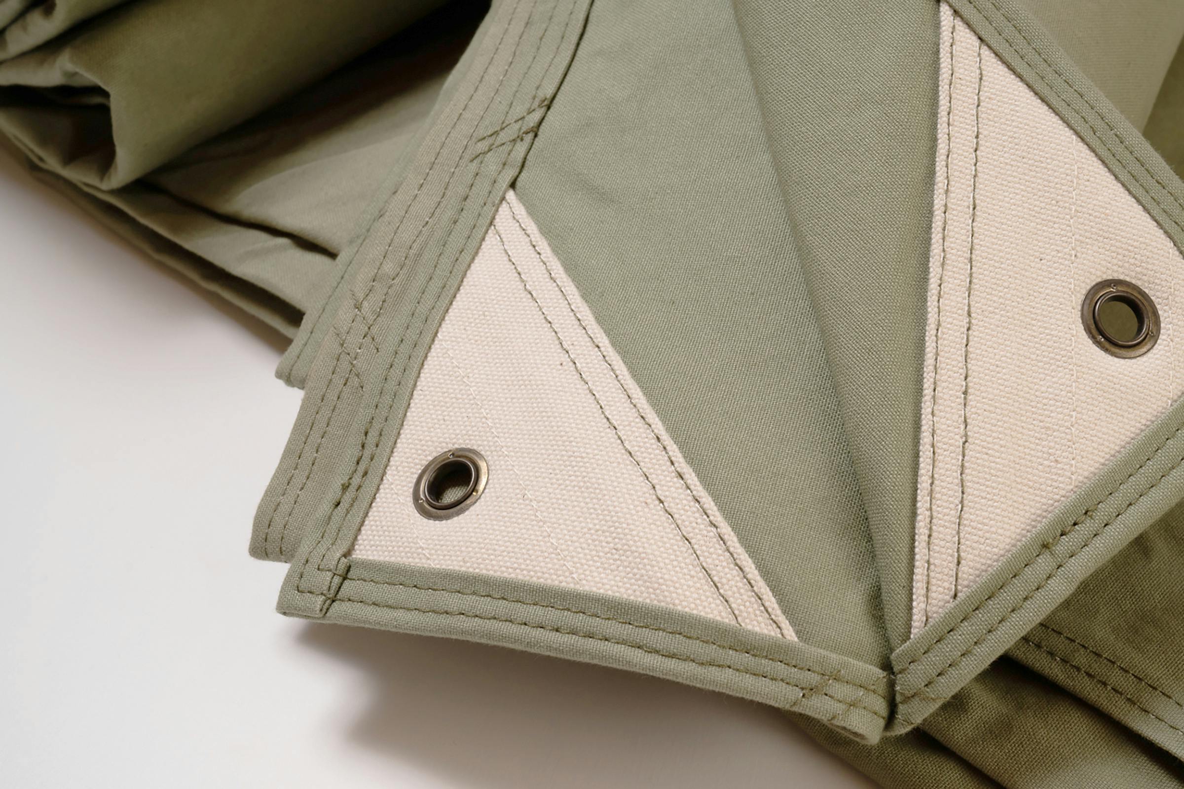 ここで採用するのは3合帆布という厚手のものですが、タケヤリにしかない、50年代のヴィンテージのシャトル織機で織られたものです。通常よりもゆっくりと圧力をかけて織っていくため、しっかりとした素材を作ることができます。力の一番かかる角にふさわしい素材です。
