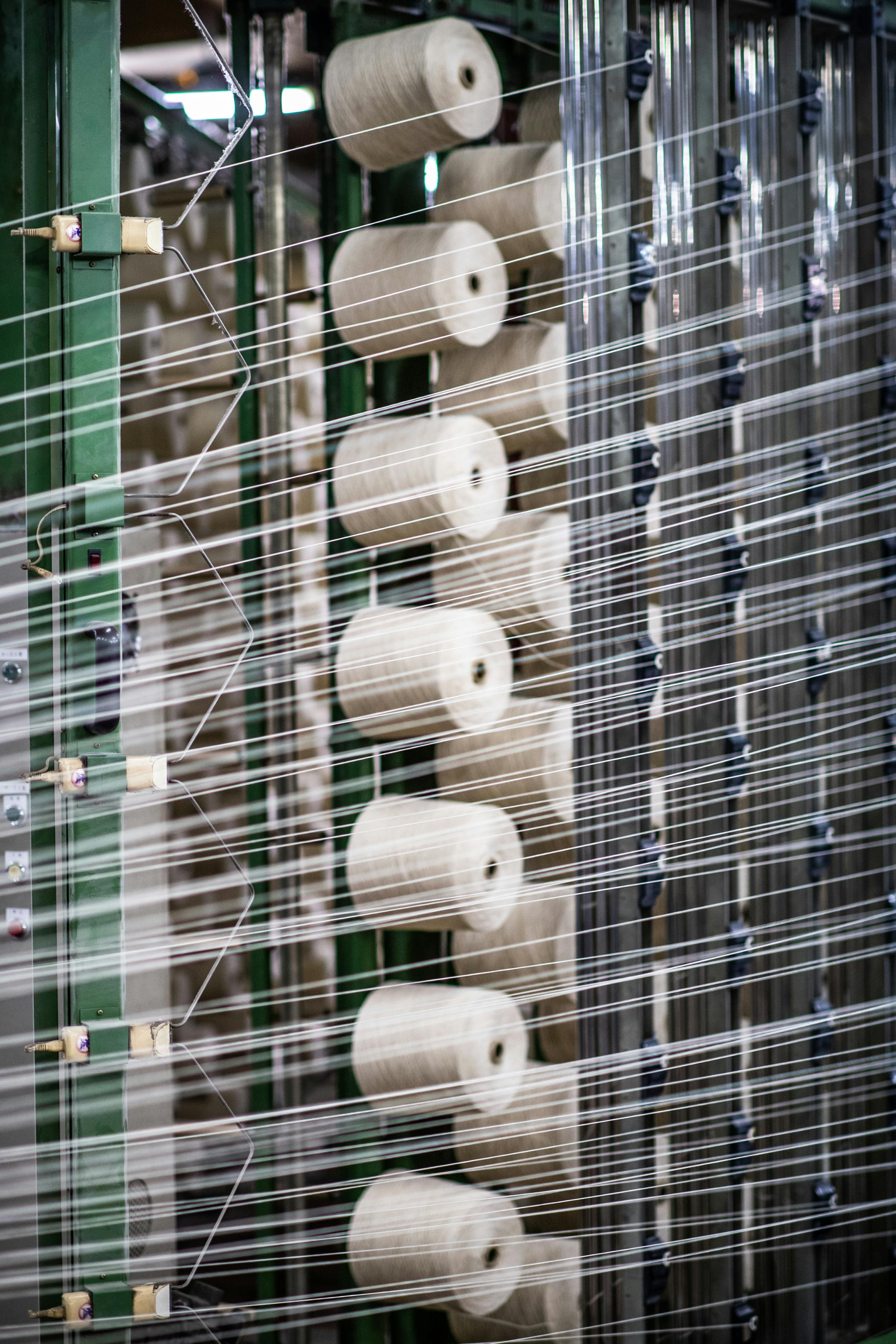 いよいよ生地の準備を進めております。当然ながら、生地を構成する糸は、一本一本丁寧に機械にかけられていきます。(写真はタテ糸のセッティングです。)