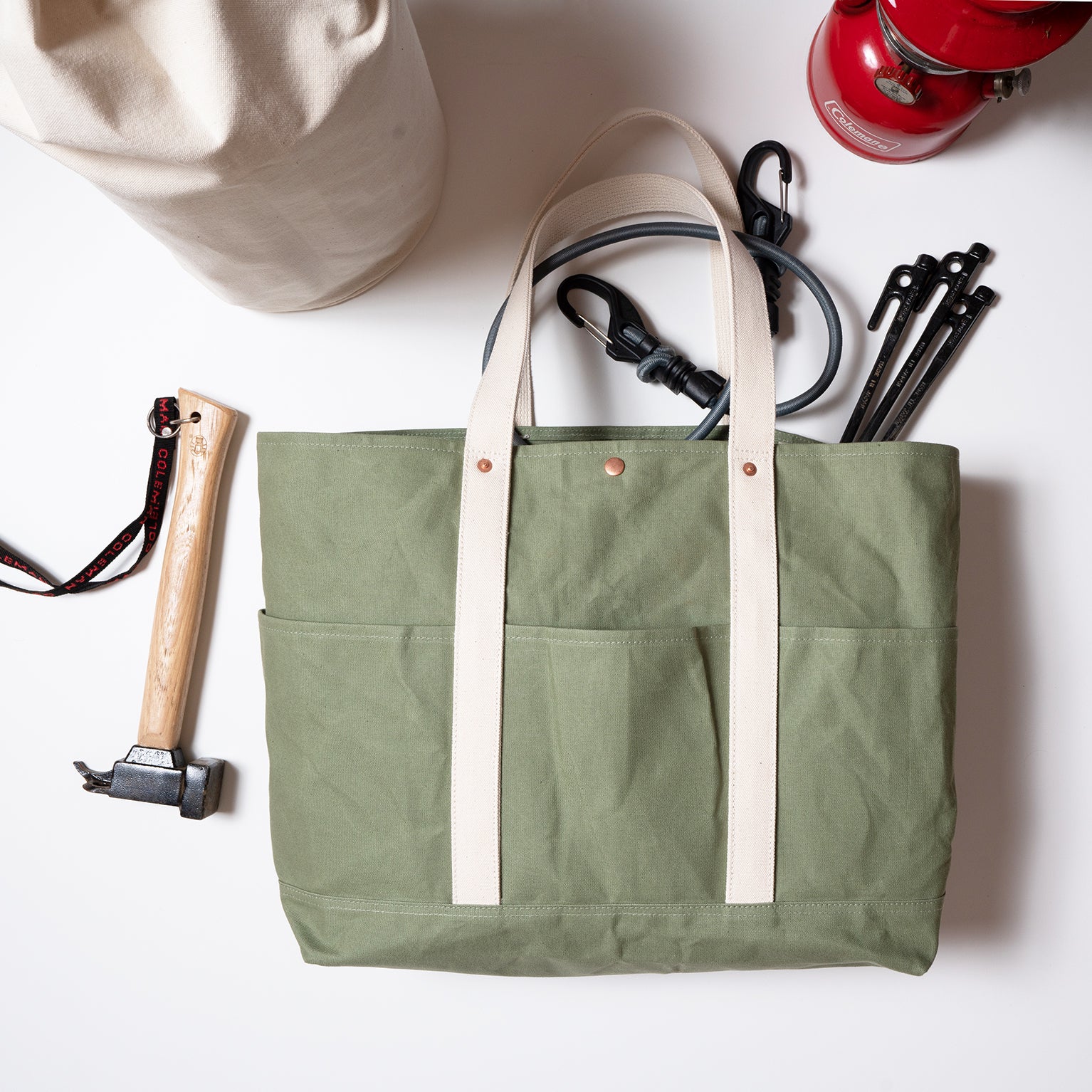 使い方色々。協力撥水のかかった生地を使用したトートですので、ギアを汚れたまま入れでも、水でガンガン洗っていただけます。また、使い込むごとに味わいが増していくのもコットンの魅力だと思います。トップはストラップをつけて安心な仕様。また、内ポケットも細かく分けられていますので、お財布、スマホなど分けて収納できます。オーセンティックなコットンキャンバスのトートですが、細かい部分までユーザー目線で整えています。
