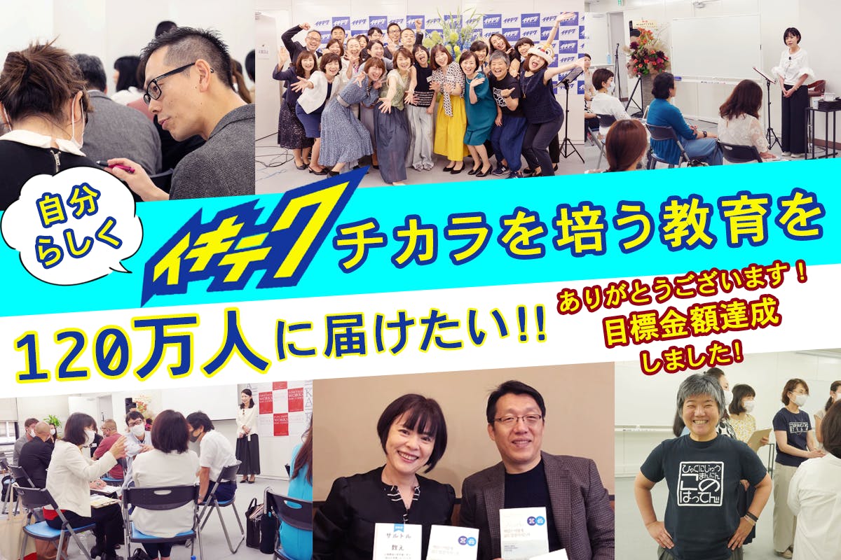 資金は最低でも300万円必要ですが、まずは120万人にイキテクチカラを培う教育プログラムを届けることにちなんで、120万円の支援を得て、広告宣伝、啓発活動を加速させていきたいと思っています。