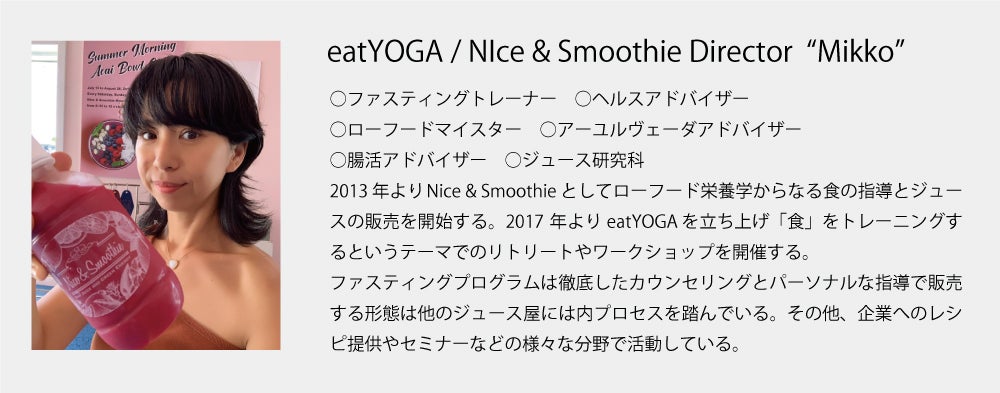 「身体の内側から綺麗に健康に」をテーマに食を通じて自身の内側に耳を傾け、自身の軸を知るための、 健康維持と未病のための予防医学を、「食」でトレーニングするコミュニティです。「Nice & Smoothie」のジュースファスティングトレーニングを中心に、ヨガとジュースを融合させたリトリートやワークショップを開催し、様々なフィールドでeatYOGAを表現してきました。ファスティングはカウンセリングを主体とし、お客様とより深くコネクトしながら食生活の改善を指導してく独自のメソッドが好評となり、現在顧客数は300人を超えています。そして、今年いよいよ、その活動の全てを秀悦させた複合施設のカフェスタジオをオープンします。