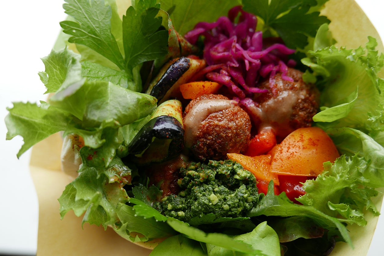 Nice & Smoothieのスロージュースでは大量の絞りカス(パルプ)が出ます。そのパルプを再利用したファラフェル・スープ・ドレッシング・スムージーなどのメニュー展開で、VEGANでありWhole foodを体感できるカフェを運営していきます。アーユルヴェーダの要素を加えたスープやキチュリ(お粥)は、ファスティングの準備食や回復食でも摂取できるようなメニューを考案していきます。メインとなる食事となる「ファラフェル」とは中近東のソウルフードで、ひよこ豆のフムスやコロッケにジュースのパルプを加えたオリジナルのレシピで野菜をたっぷりと挟んだ食べごたえのあるVEGANサンドイッチになります。葉山の海から近い店舗で、よりクイックにテイクアウトできるような身体に優しいジュースやサンドイッチなどのファストフードを提案していきます。eatYOGAstudioでは、「身体にも優しく、地球にも優しい。」ということをテーマにした商品開発を行っていきます。