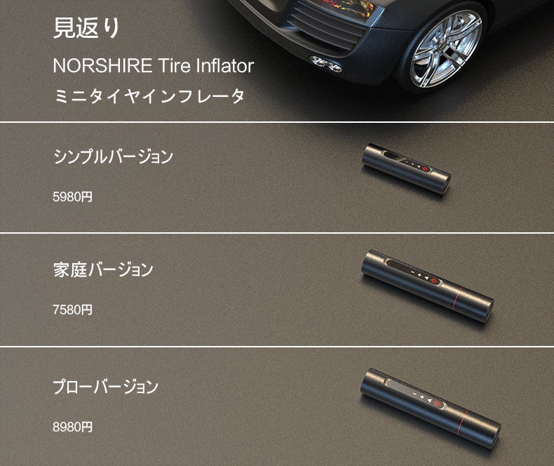 このたび、自社で開発された【NORSHIRE】ミニ空気入れを日本の皆様にご紹介いたします。【NORSHIRE】ミニ空気入れは、アメリカや韓国で行ったクラウドファンディングで大好評でした。アメリカのアマゾンでも販売しています。今度、初めて日本でクラウドファンディングを行います。必ず、皆様に便利さをもたらす商品だと信じております。また、【NORSHIRE】ミニ空気入れは知的財産権を持ち、且つPSEの認証も取得しておりますので、皆様、安心してご購入ください!