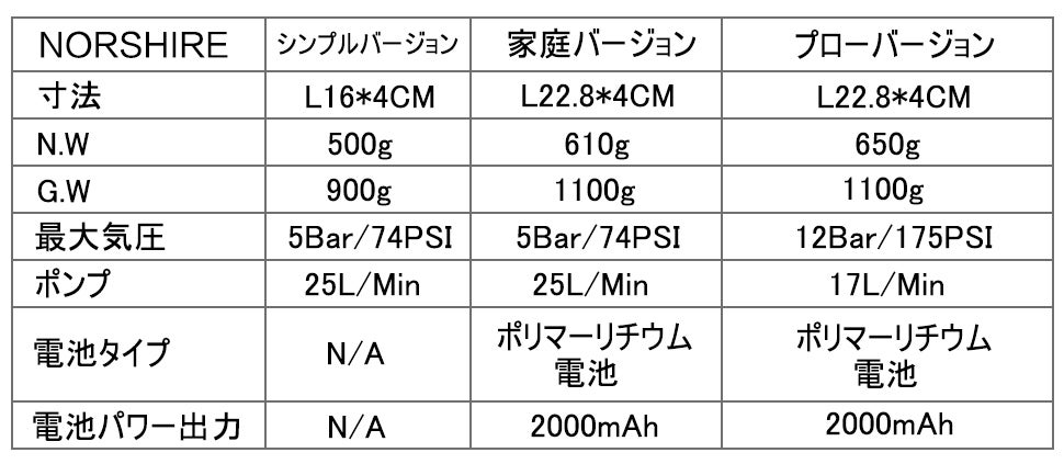 三つのバージョンはほぼ同じ構造となっております。電池の有無に関わらず、直接シガーライター12Vで電源を入れることが可能です。ただし、シンプルバージョンは電池付いてないため、シガーライターが必要です。シガーライター を付いてない自転車やバイクには使えないですけど、サイズや値段からいうと、コンパクトカーをお持ちの方にはかなりお得だと思います。プローバージョンは最大気圧が12Barなので 、ロードバイクやトラックにも適しています。