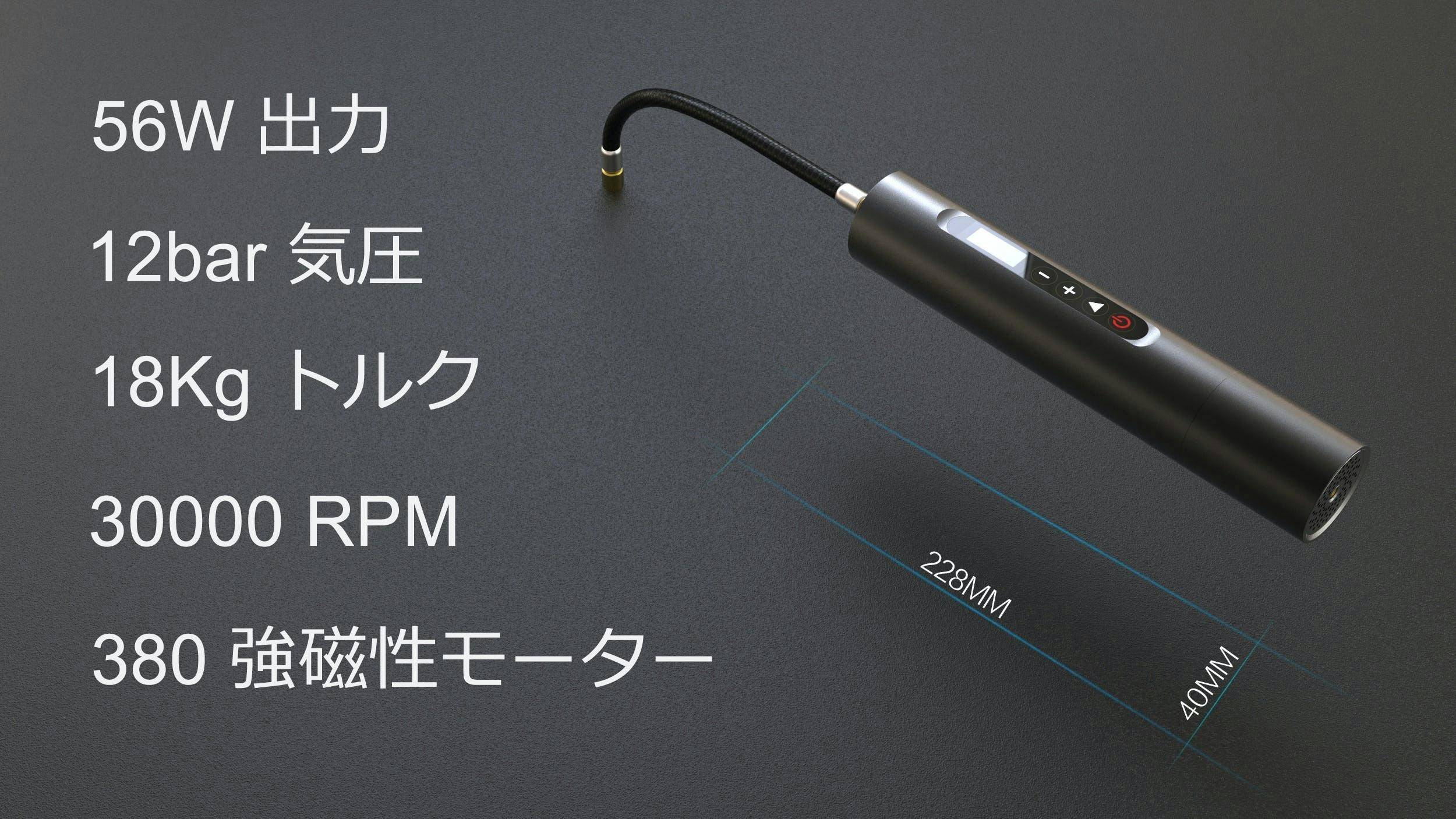 【NORSHIRE】ミニ空気入れは高質の強磁性380モーターを使用しているので、高速回転性能を持ち、1分ごとに30000回転数に達し、出力は相当大きい、具体的には56wとなります。【NORSHIRE】本体は18キログラムのトルクが発生し、12bar/1.2 MPa/175PSIの気圧を達し、そして1分ごとに17-25リットルの空気を作り出せます。