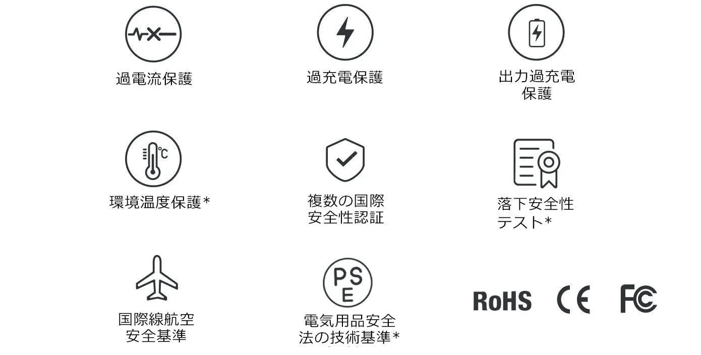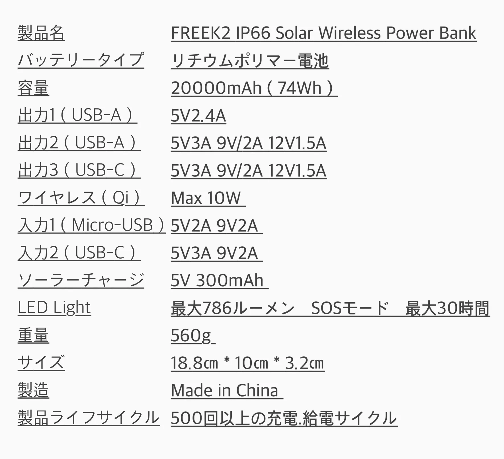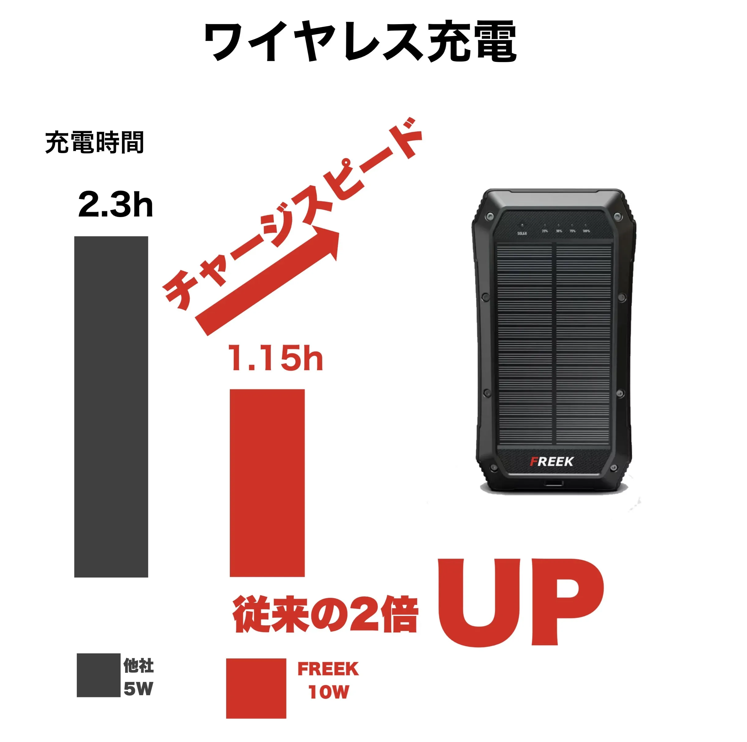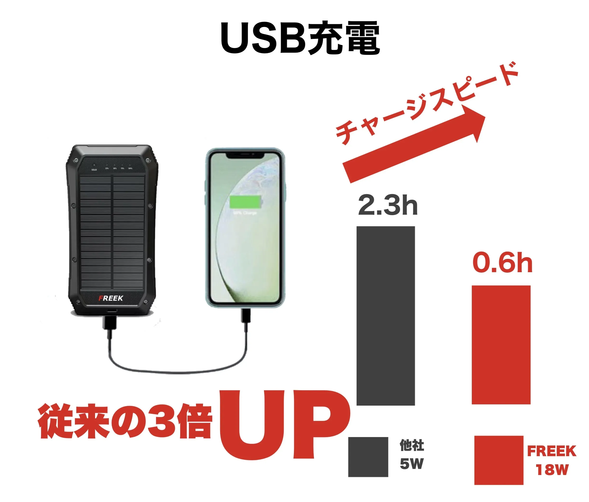 USB-C接続で通常の5V1A型モバイルバッテリーよりも、蓄電速度が約80%も速いです。20,000mAhの大容量ですが、およそ6時間でフルチャージできます。就寝前にセットしておけば、朝から電力満タンのFREEKを1日中ご活用頂けます。