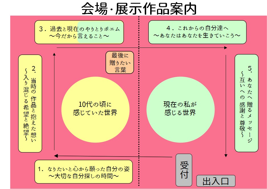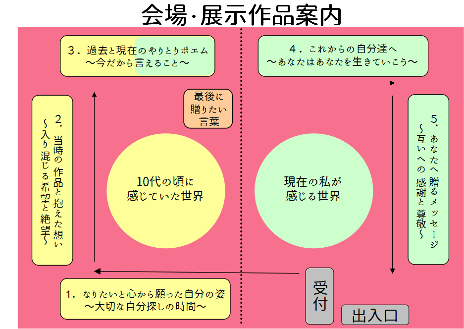 ひとつひとつの作品には、10代の私の想いとそこに向けた現在の私からのMessageを、また現在の私の想いを添えています。