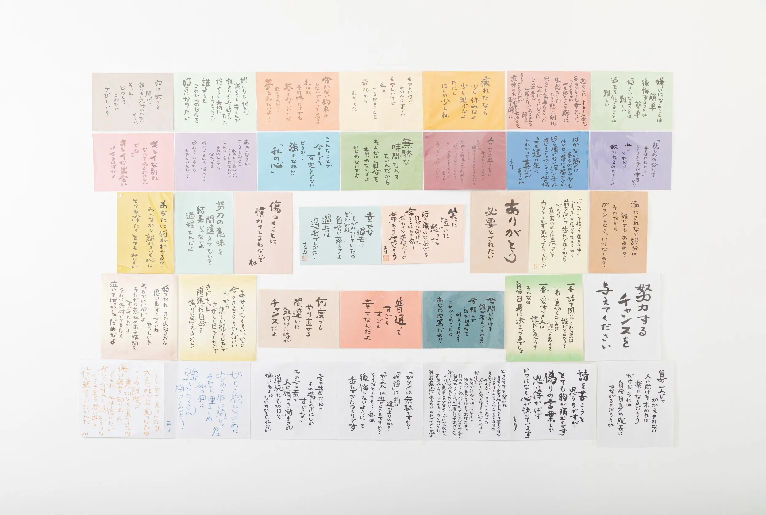 小学校、中学校、高校のときに溢れてくる感情を言葉に、宛もなく描いていた「宛先のない言葉たち」。全てを見せることで、必要な方に何か届けることが出来ればと、願いを込めて展示した。当時描いた原本。