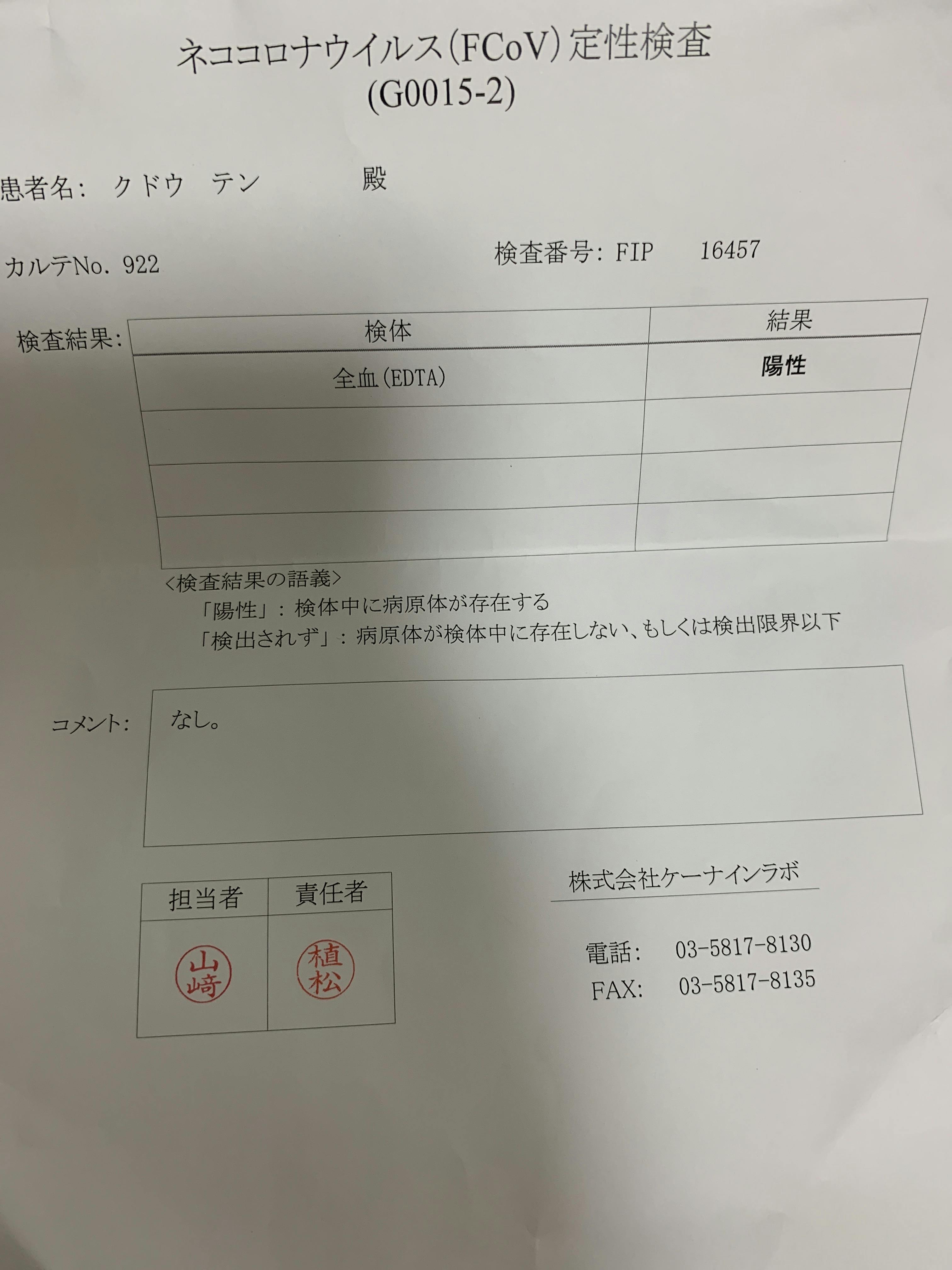 7月28日病院から電話がきてFIP陽性の結果を聞きました。