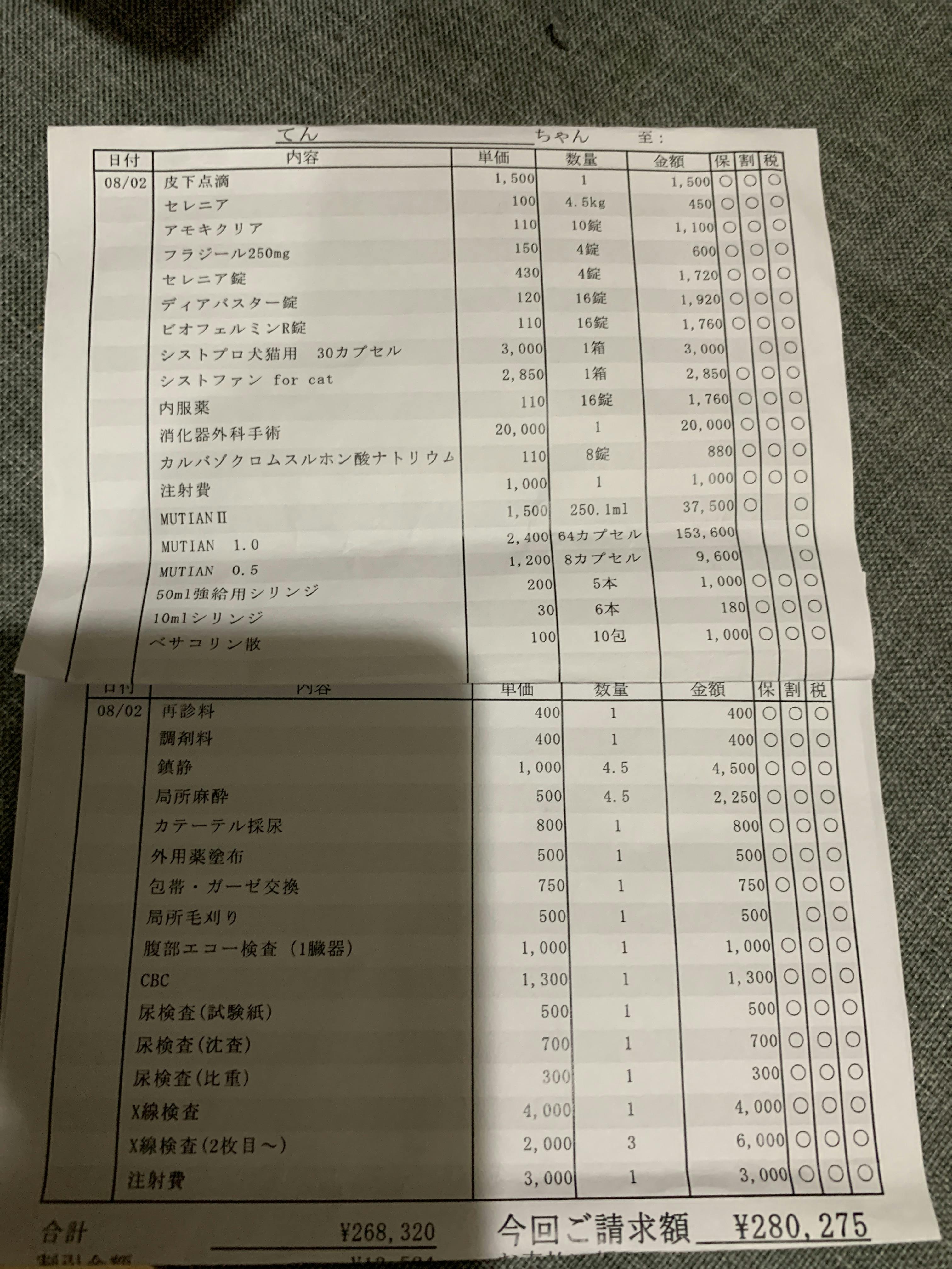 7月中旬頃おしっこの失敗と後ろ足の歩き方が少し違和感を感じて病院に行って尿検査と血液検査をしました。2日後血液検査の結果が出て蛋白の数値が異常に高く、ステロイドを3日間飲ませる事になったのですが足のふらつきがは改善されずセカンドオピニオンで他の病院を訪ねました。そこで血液検査の結果を見せてFIP(猫伝染性腹膜炎)の可能性が高くFIPだった場合延命治療しか出来ないと言われネットでFIPの事を調べて幸いな事に近くにFIP協力病院を見つけ予約を取り見てもらう事にしました。