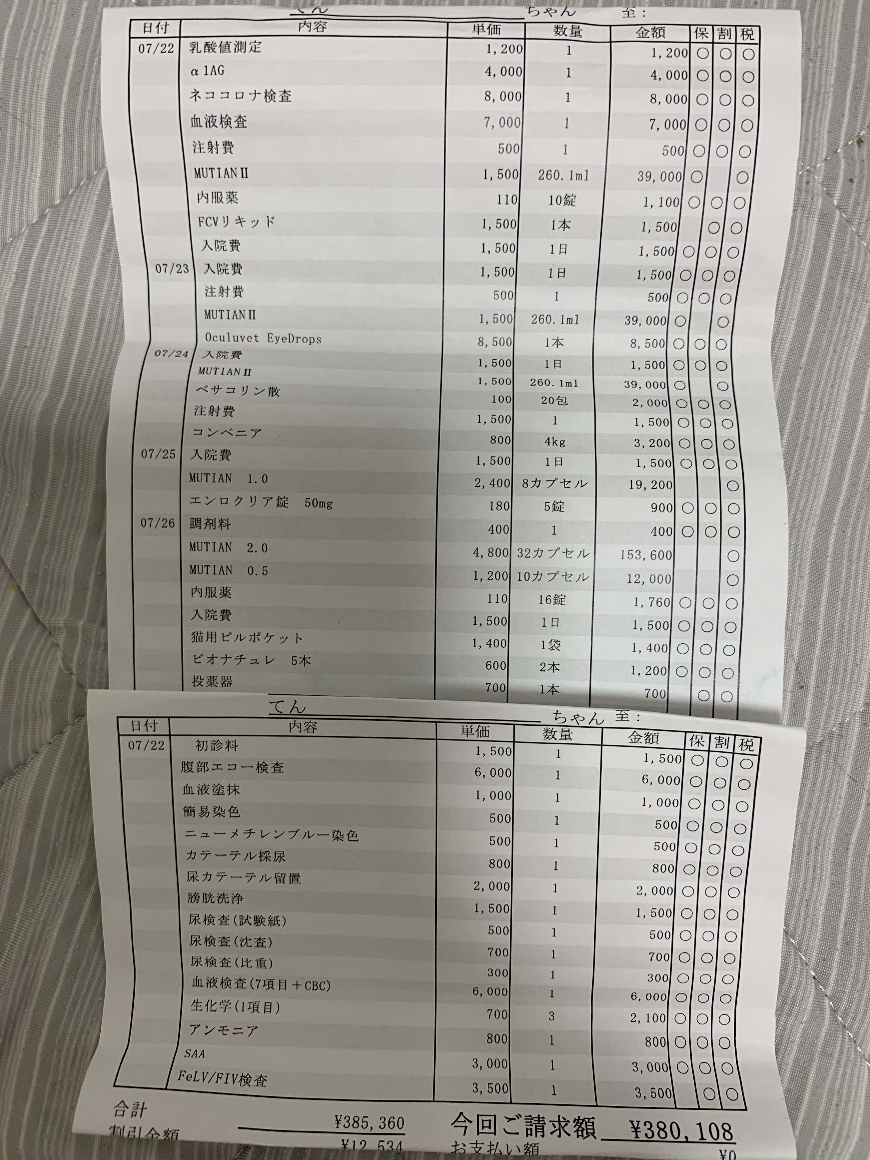 7月中旬頃おしっこの失敗と後ろ足の歩き方が少し違和感を感じて病院に行って尿検査と血液検査をしました。2日後血液検査の結果が出て蛋白の数値が異常に高く、ステロイドを3日間飲ませる事になったのですが足のふらつきがは改善されずセカンドオピニオンで他の病院を訪ねました。そこで血液検査の結果を見せてFIP(猫伝染性腹膜炎)の可能性が高くFIPだった場合延命治療しか出来ないと言われネットでFIPの事を調べて幸いな事に近くにFIP協力病院を見つけ予約を取り見てもらう事にしました。